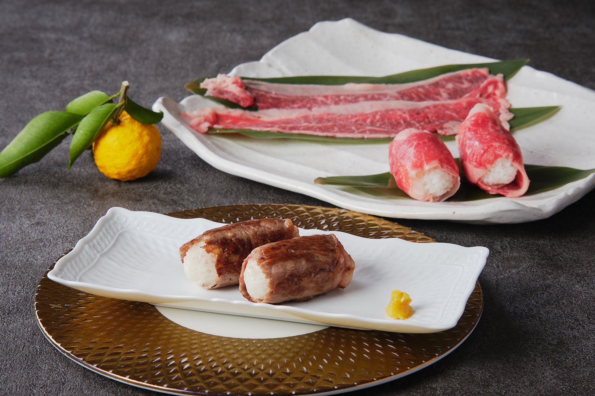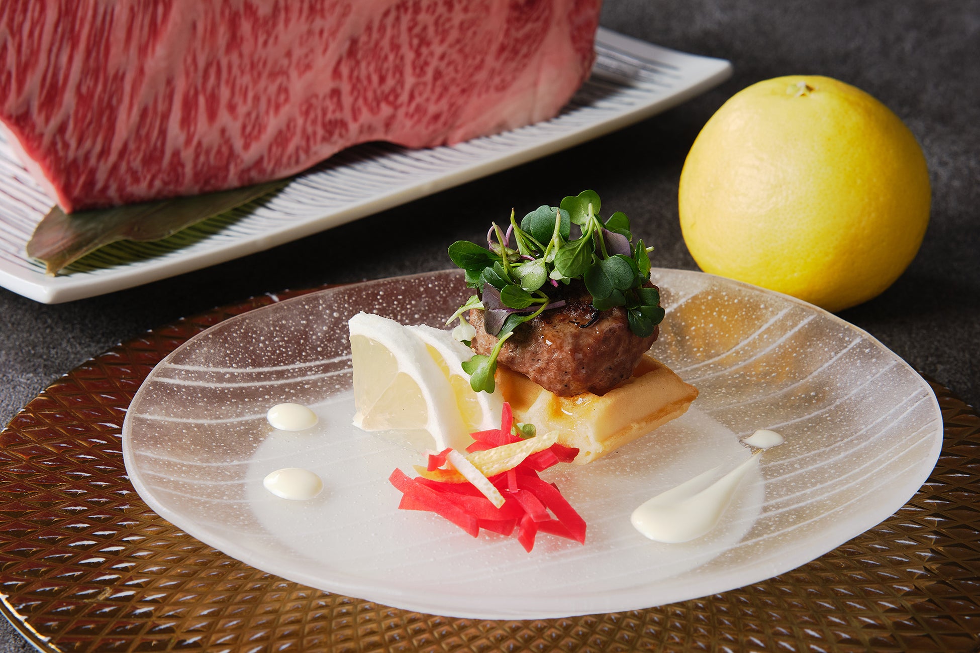 前菜には鉄板で仕上げる宮崎牛のハンバーグをワッフル仕立てでご用意。宮崎県特産の柑橘“日向夏”を使用した自家製マヨネーズソースと共にお召し上がりいただきます。メインディッシュではきめ細やかな霜降りとやわらかな肉質が特徴の宮崎牛ロースをステーキでお届けします。また、コースを締めくくるガーリックライスは匠特製の宮崎県産 黒毛和牛の肉巻きおにぎりへのアップグレードも可能です。