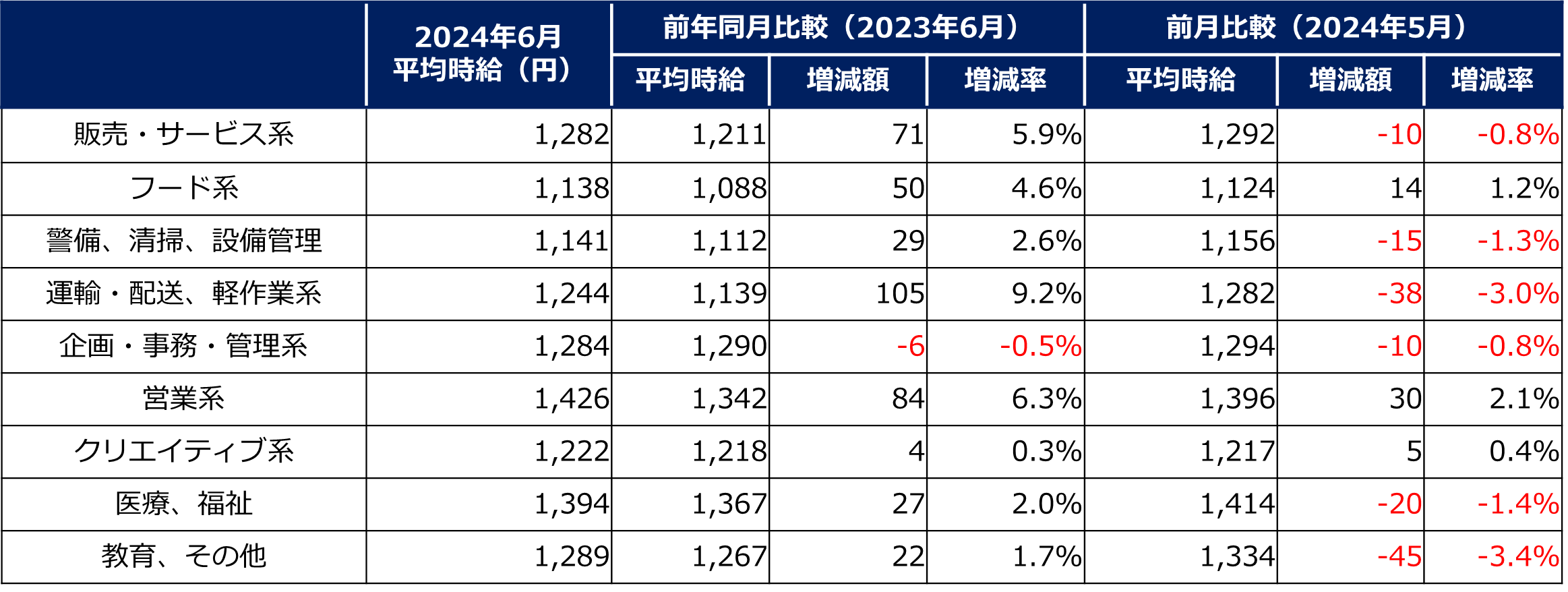 職種別平均時給は、【企画・事務・管理系】のみ前年同月比マイナスに。