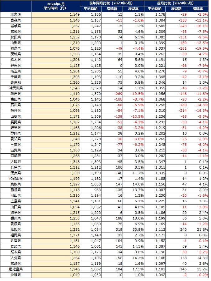 6月度平均時給、三大都市圏は1,305円。全国は1,202円。