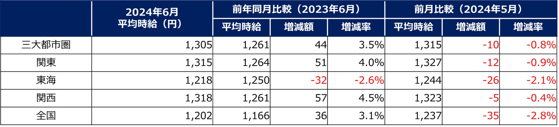 ・三大都市圏、全国平均時給、ともに前年同月比を上回る結果に。
