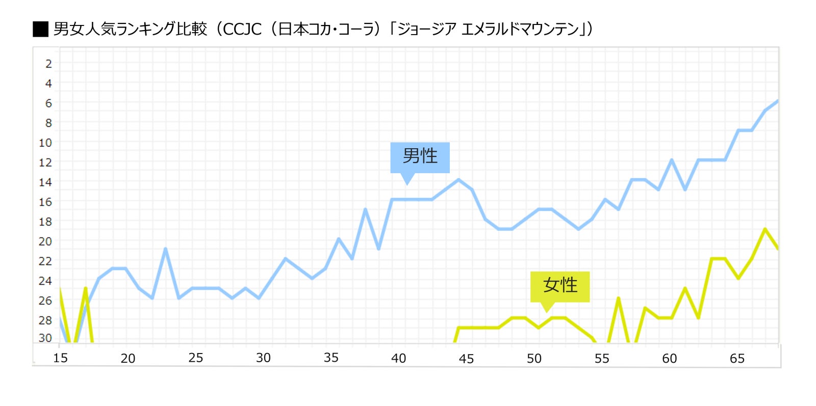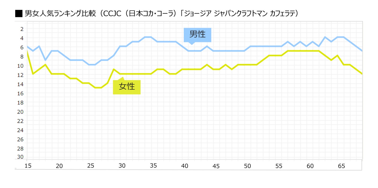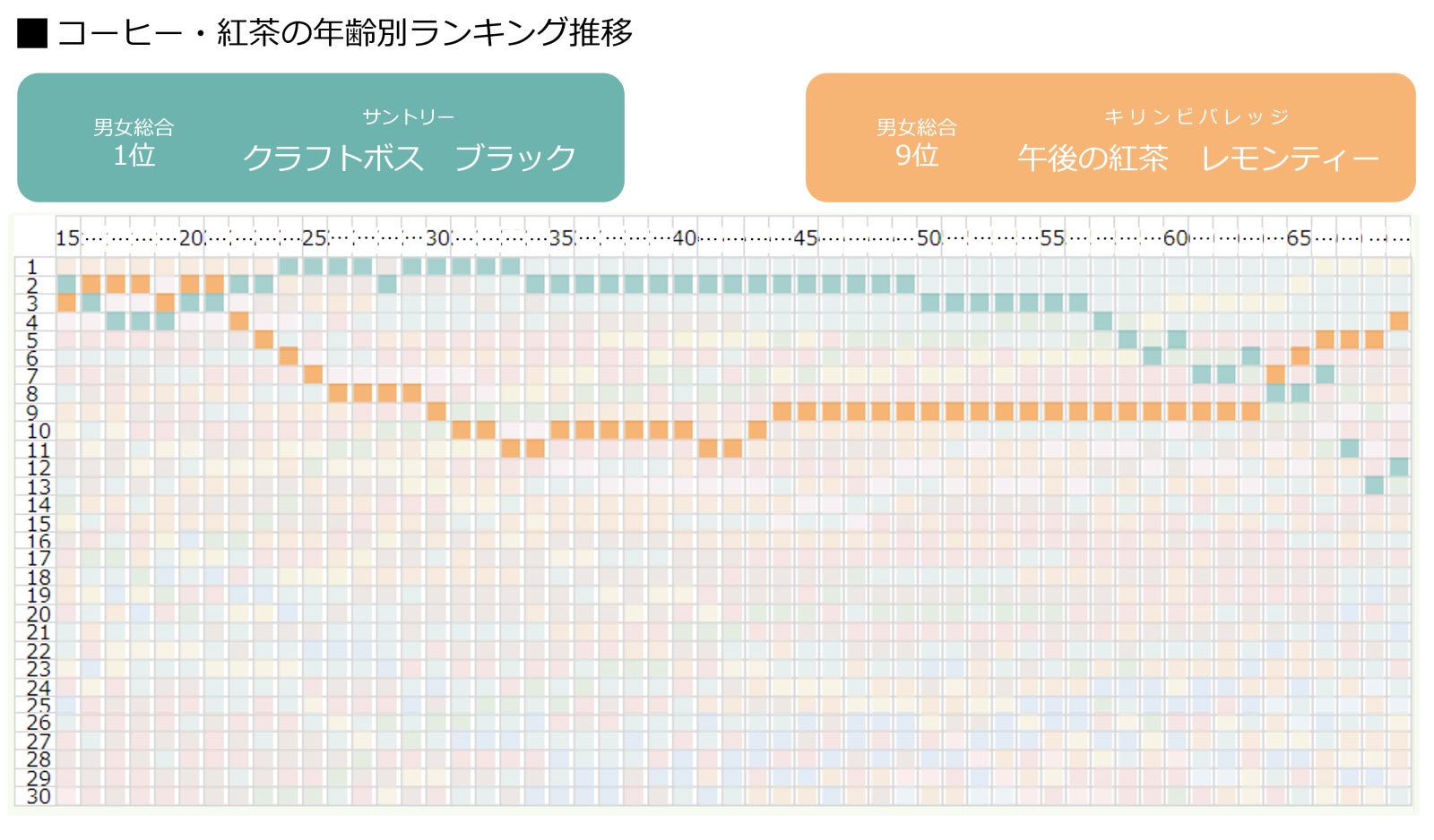総合ランキング1~3位を占めたのは「クラフトボス ブラック」「クラフトボスティー」「クラフトボス ラテ」と、同シリーズからブラックコーヒー、紅茶、ラテがバランスよくランクインしました。クラフトボスシリーズの人気がうかがえる結果となりましたが、性別や年齢によって購入する商品がどのように変化するのか、ブランドごとに1歳刻みのランキングを読み解きます。