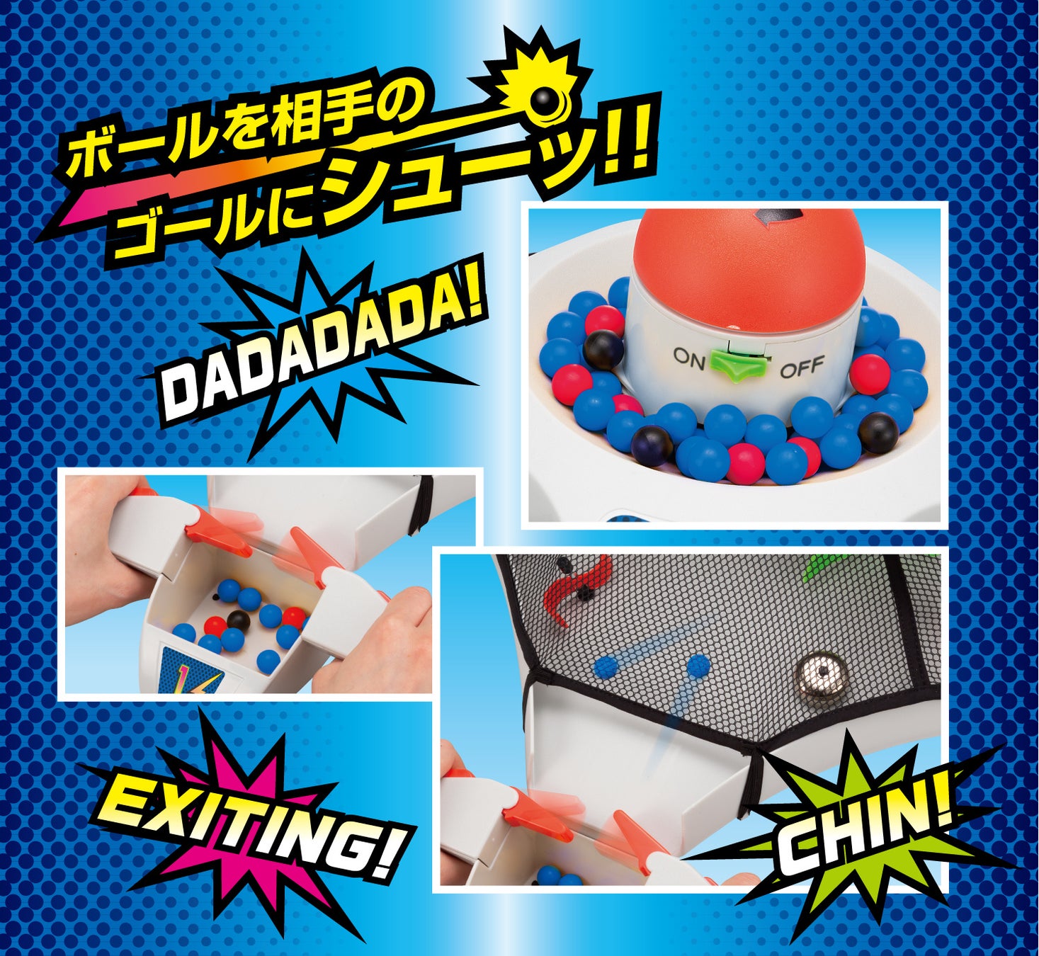 本体中央上部からランダムに落ちてくるボールをフリッパーではじいて相手のゴールにシュートしていきます。弾いたボールがベルに当たると「チンッ!チンッ!」と鳴り、よりエキサイティングなゲーム展開が楽しめます。ボールが落ちきった時点で、プレイヤー全員で自分のゴールに入ったボールをカウントし一番点数の高い人が勝ちとなります。2人~4人で対戦可能です。