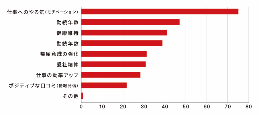 福利厚生の充実は社員にどのような効果があるかを聞くと最も多かった回答が「仕事へのやる気(モチベーション)」と答えた人が75.1%。続いて「健康維持」が47.0%、「勤続年数」が41.1%となりました。