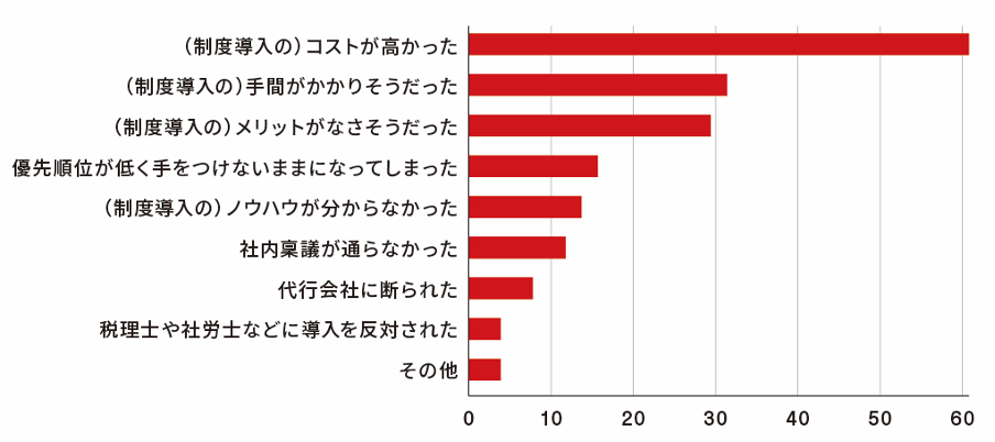 借り上げ社宅を検討したが導入しなかった理由を聞くと最も多かった回答が「(制度導入の)コストが高かった」と答えた人が60.8%。続いて「(制度導入の)手間がかかりそうだった」が31.4%、「(制度導入の)メリットがなさそうだった」が29.4%となりました。