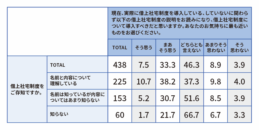 借上社宅制度について、「名前は知っているが内容はよく知らない」「知らない」のうち、内容を理解した場合に導入に前向きな回答は約3割となった
