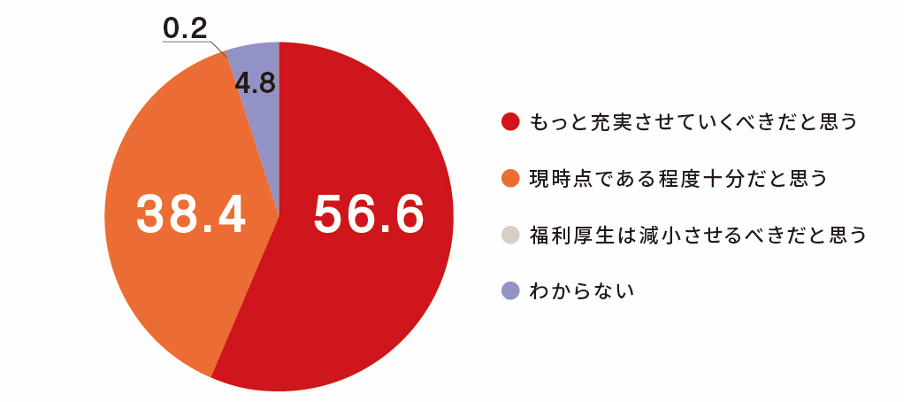 福利厚生を「もっと充実させていくべきだと思う」人が56%と過半数を占めますが、「現時点である程度十分だと思う」人も38.4%と少なからずいるようです。