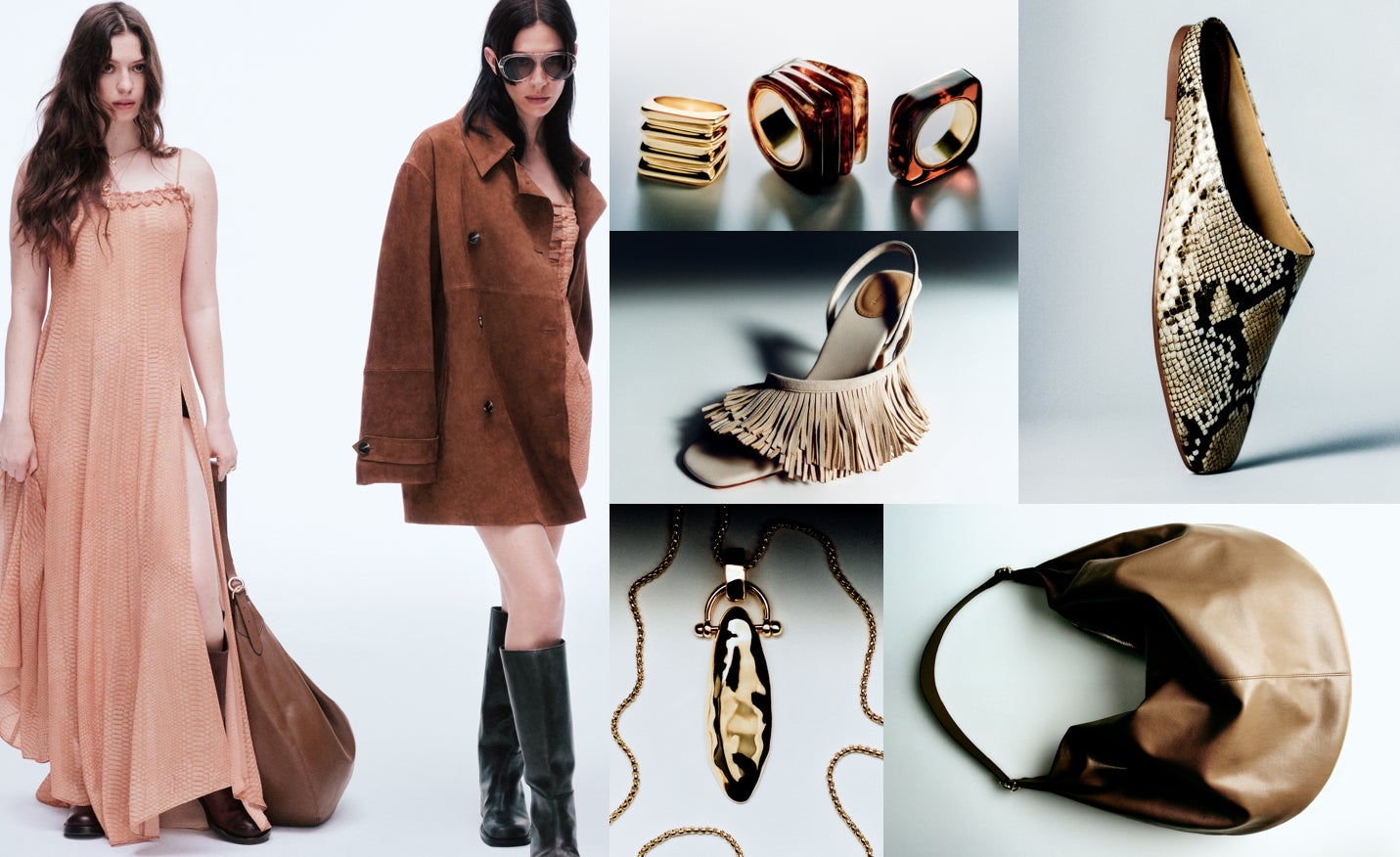 アクセサリーはボーホースピリットを感じさせる、レースアップのステッチなどの仕上げが施された、さまざまなサイズのショルダーバッグが登場します。さらに、パイソン柄のスリッパやベルト、バイカーブーツと合わせることによりスタイリッシュな印象になります。ジュエリーは、アンティーク・スタイルのペンダント・ネックレス、タッセル・イヤリング、チャンキー・バングルやチョーカー、リングやエレガントなカフスが揃い、メタルとレジン両方の素材で展開されています。 そしてパイロット・サングラスがルックを引き締めてくれます。