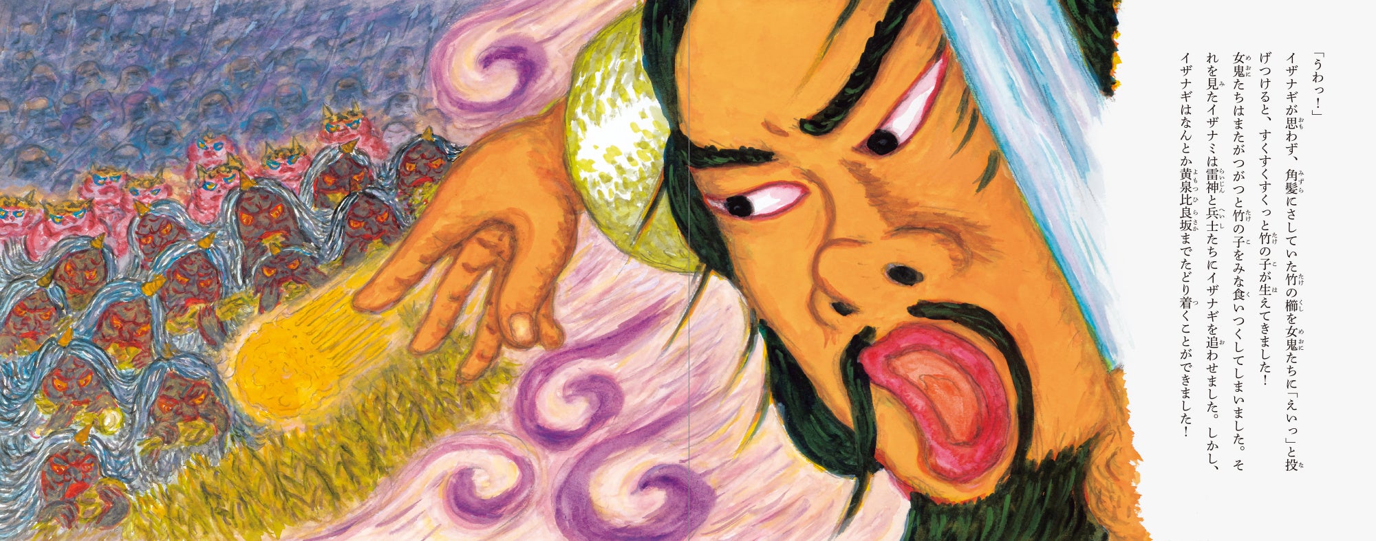 はるか昔、イザナギとイザナミの二人の神が結婚し、アメノヌボコを使って日本の島々を生み出しました。二人は次々に神を生みますが、火の神を生んだとき、イザナミは火に焼かれ、黄泉の国へ旅立ってしまいます。飯野和好が描く、大迫力の神話シリーズ。