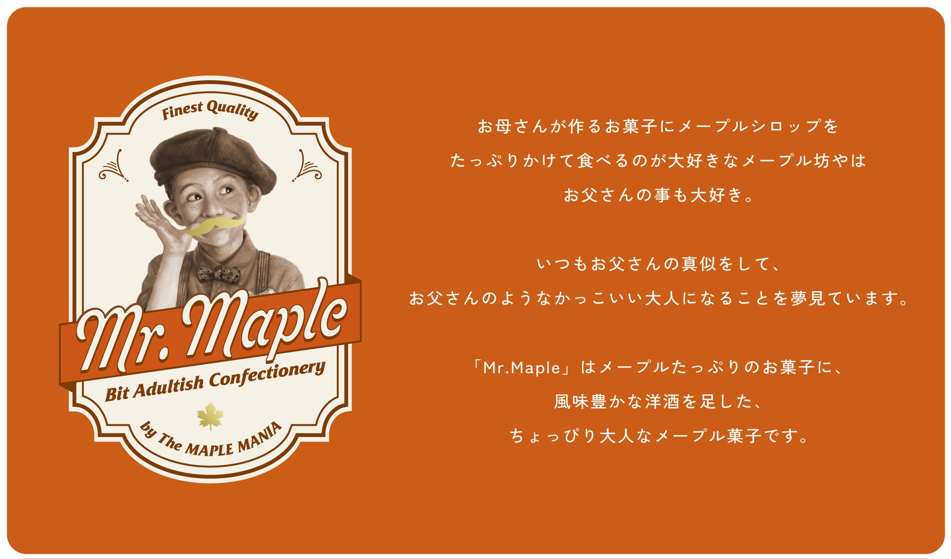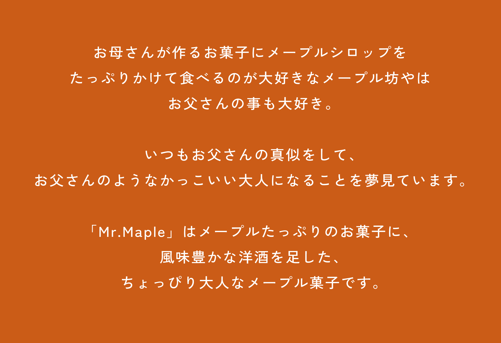 「Mr.Maple」はメープルたっぷりのお菓子に、風味豊かな洋酒を足した、ちょっぴり大人なメープル菓子です。