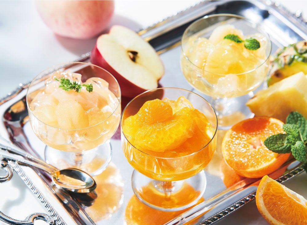 国産果実 2 種類のペアリングが爽やかなジュレ。「ル レクチェ&パイナップル」「伊予柑&みかん」「白桃&りんご」の 3 種類をご用意しました。