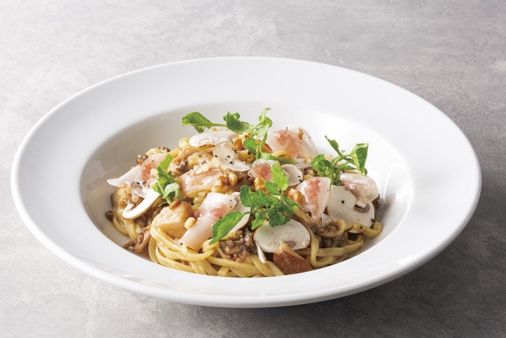 マッシュルームと香味野菜をじっくり煮込んで作ったソースに、芳醇なポルチーニを加えた「きのこのラグー グアンチャーレ添え リングイネ」は、豚の頬肉を塩漬けにして熟成させた良質な脂の甘さと風味が強く、口溶けなめらかなグアンチャーレとくるみを添えた一皿に。