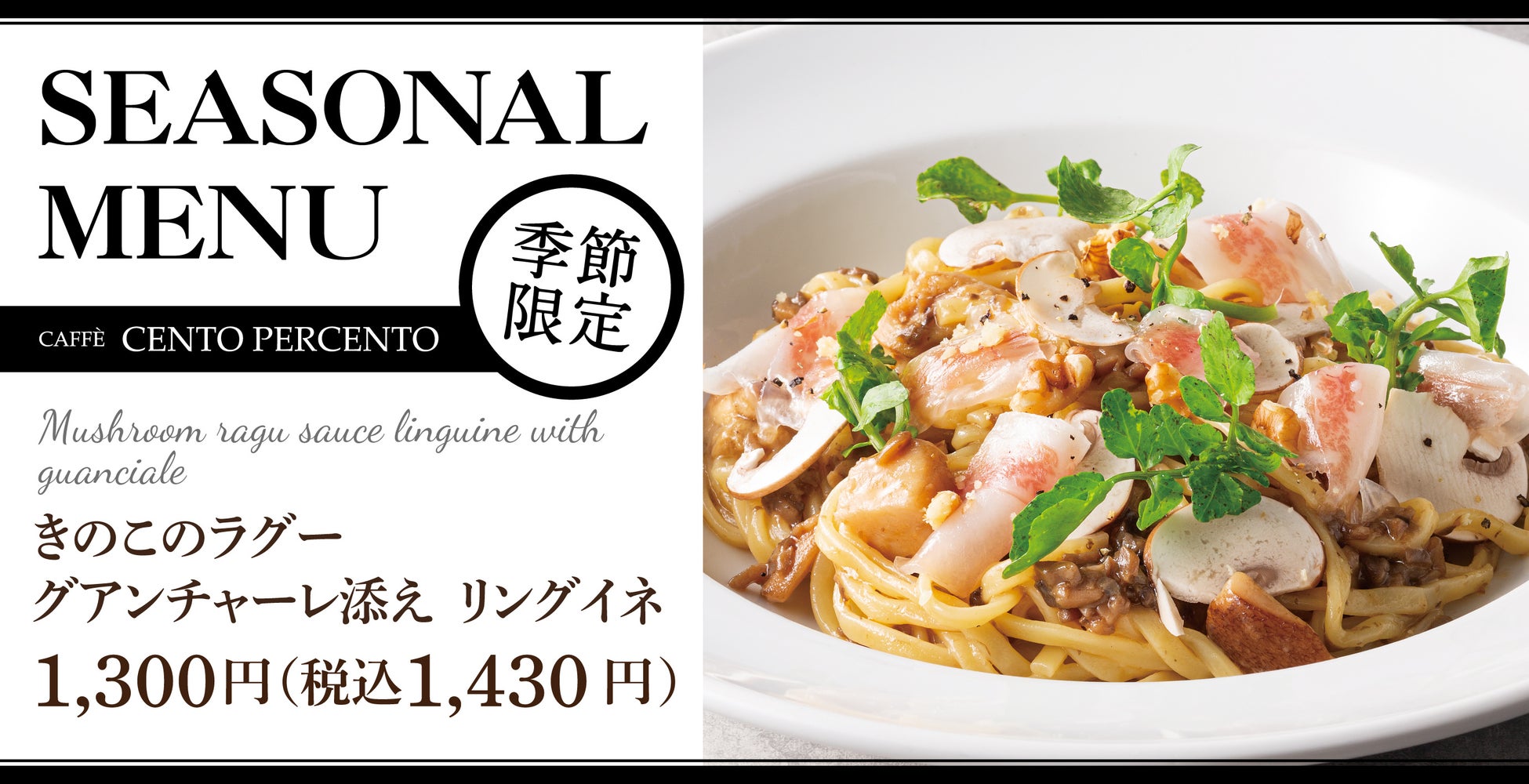 親しみのあるイタリアンで、日常に上質感を楽しむ大型ホームセンター内のカジュアルレストラン「チェントペルチェント」にて、深まる秋に相応しい季節限定メニュー「きのこのラグー グアンチャーレ添え リングイネ」、「モンテビアンコ」を2023年11月1日(水)より販売開始いたします。