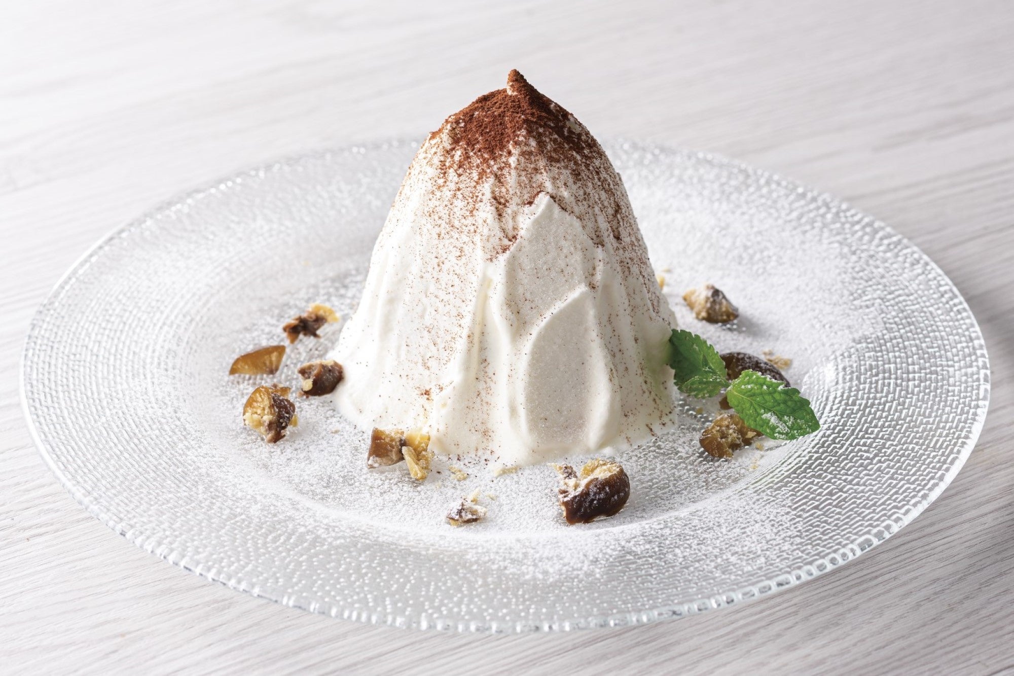 これまでの期間限定メニューでもリクエストの声が多い、和栗を使用しイタリア語で「モンブラン」を意味する「モンテビアンコ」が復活いたします。イタリアとフランスの国境にあるヨーロッパ最高峰、標高4,807mの名峰を指し、その白い山のように栗と生クリームをシンプルに合わせた秋に恋しくなるスイーツです。