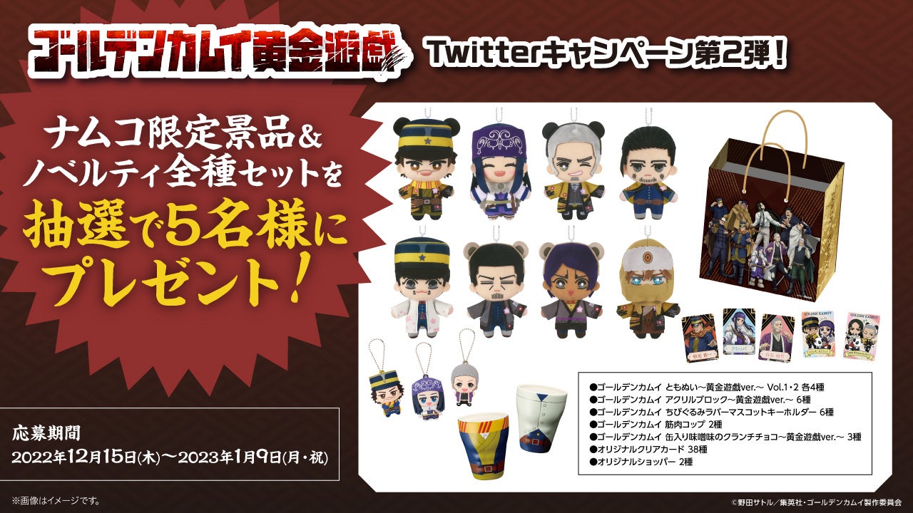 「ゴールデンカムイ 黄金遊戯」公式Twitterをフォローし、対象のツイートをリツイートした方の中から抽選で5名さまに「ナムコ限定景品&ノベルティ全種セット」が当たるプレゼントキャンペーンを12月15日(木)よりスタートします。