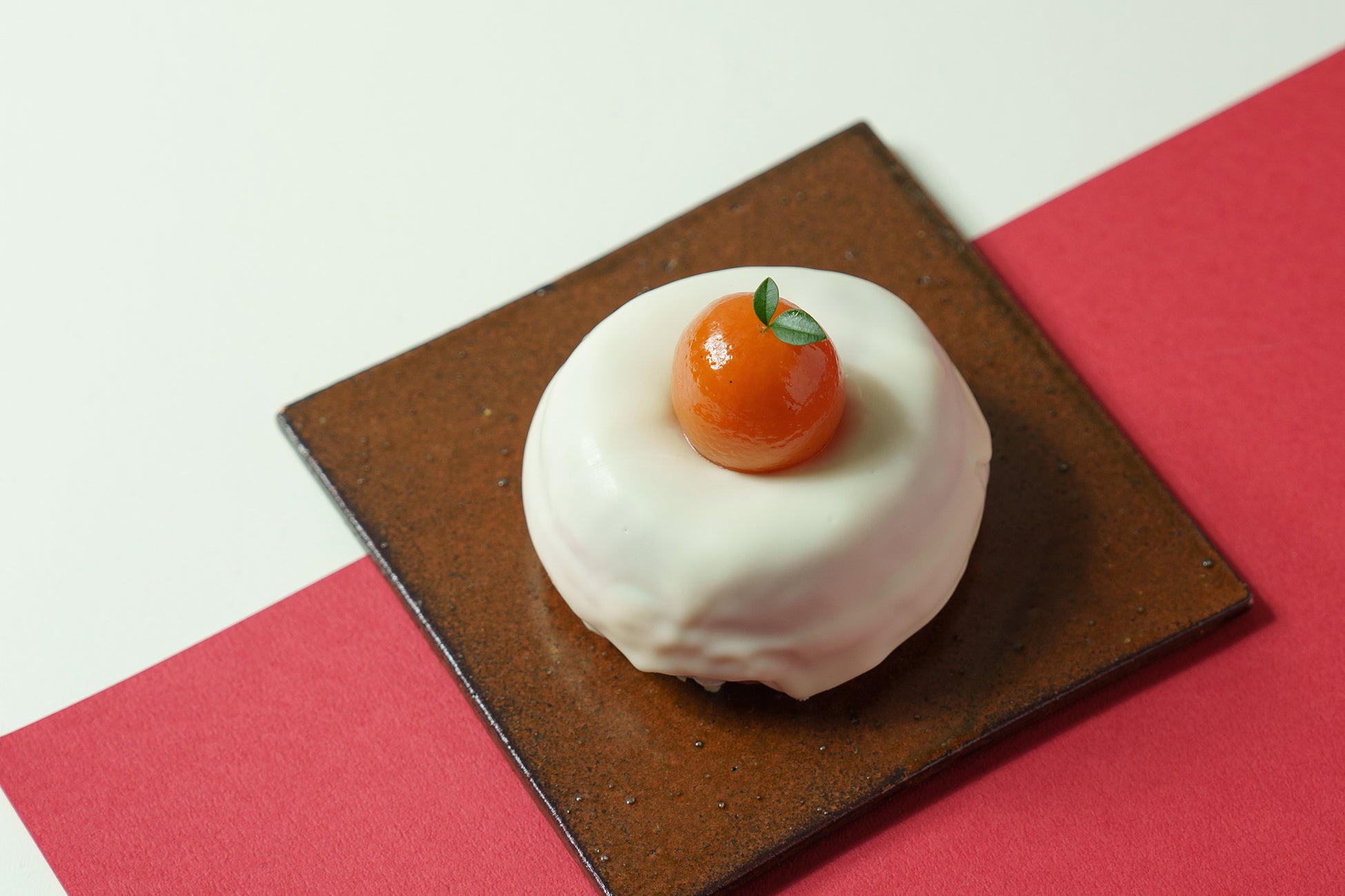 イースト生地にたっぷりのホワイトチョコを付けて、ほのかな苦みと爽やかな酸味が美味しい国産金柑のコンポートを乗せました。鏡もちのような、お正月らしいドーナツです。