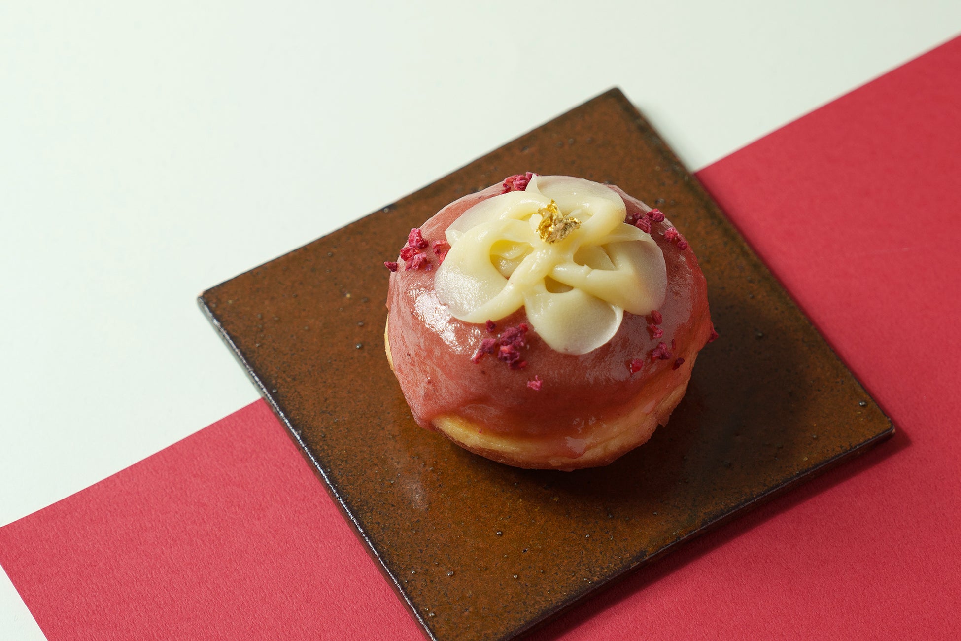 甘酸っぱい有機ストロベリーのグレーズに、白あんをふんだんに使用したバタークリームでお花を描きました。新春ならではの、華やかで可愛らしいドーナツです。