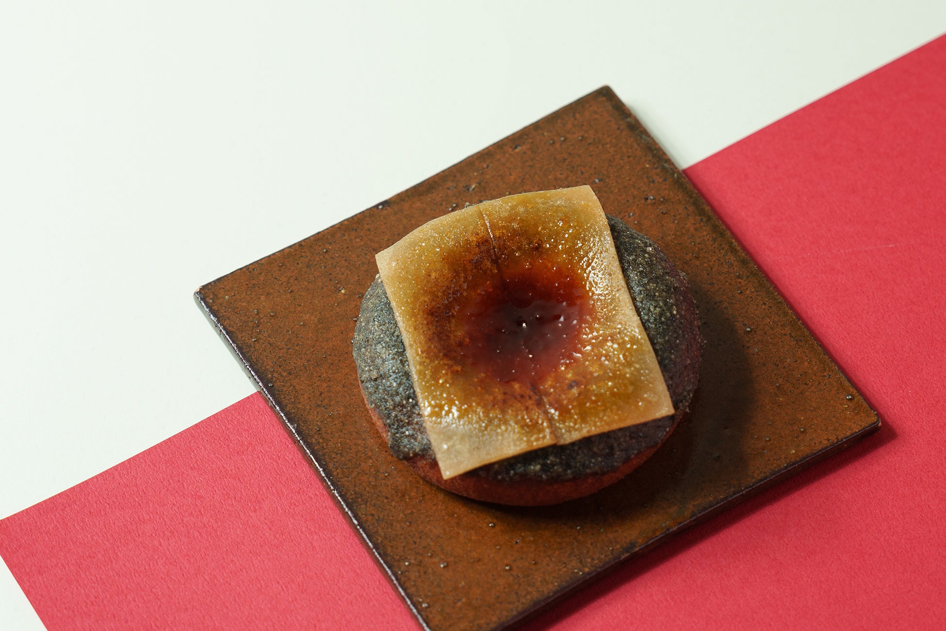 有機黒ごまと有機醤油のグレーズに、京都の名店「井筒八ッ橋本舗」の生八ッ橋を乗せてキャラメリゼした和ドーナツ。香ばしい黒ごまとみたらしの甘塩っぱい組み合わせがクセになる一品。