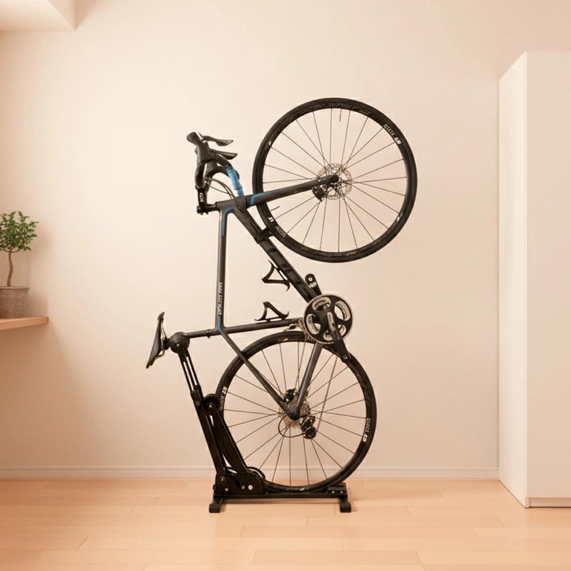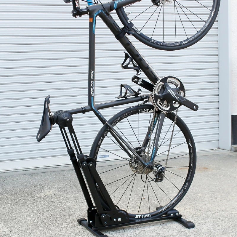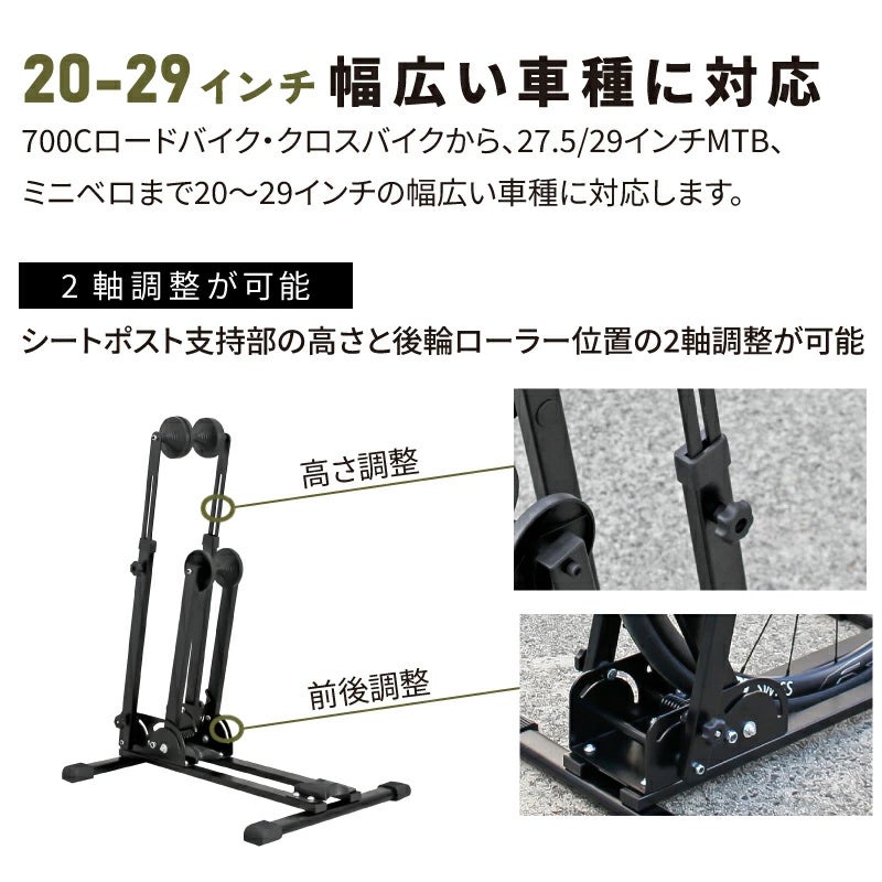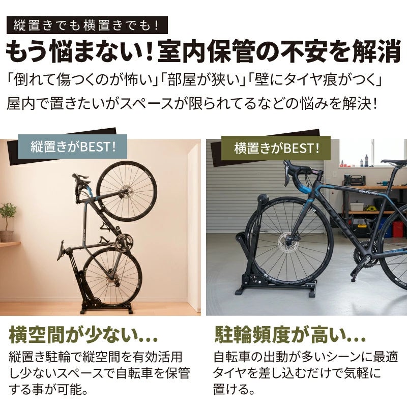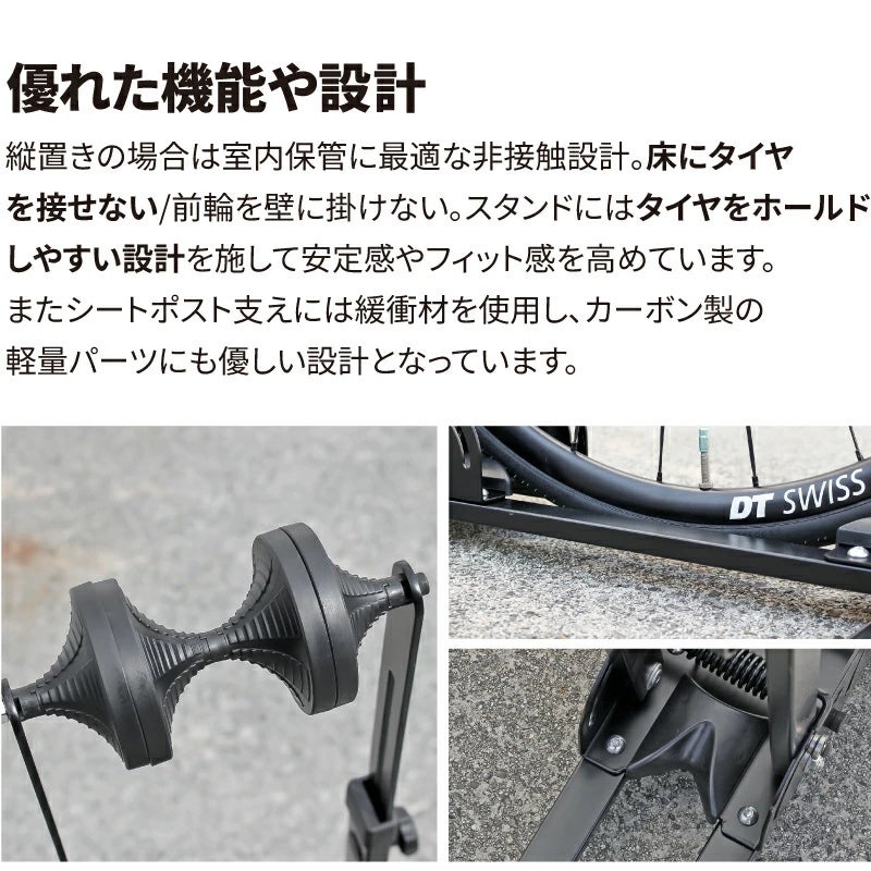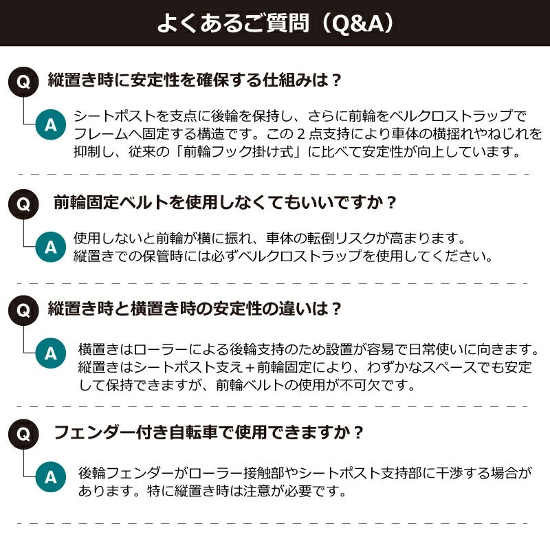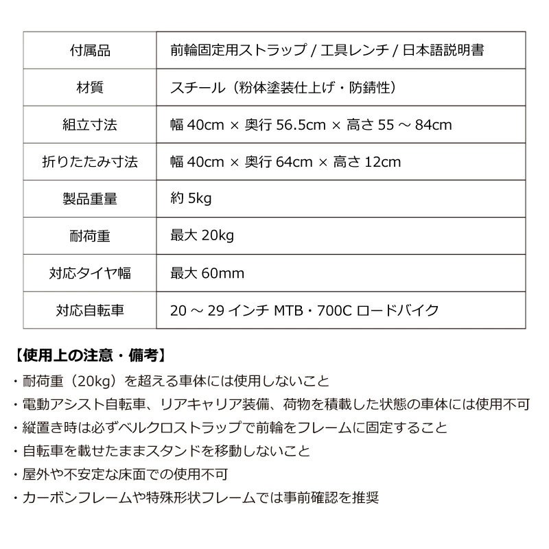 ・表皮の清掃:湿った柔らかい布で汚れを拭き取り、乾燥させてください。 ・耐荷重(20kg)を超える車体には使用しないこと ・電動アシスト自転車、リアキャリア搭載自転車、荷物を積載した状態の車体には使用不可 ・縦置き時は必ずベルクロストラップで前輪をフレームに固定すること ・自転車を載せたままスタンドを移動しないこと ・屋外や不安定な床面での使用不可 ・カーボンフレームや特殊形状フレームでは事前確認を推奨