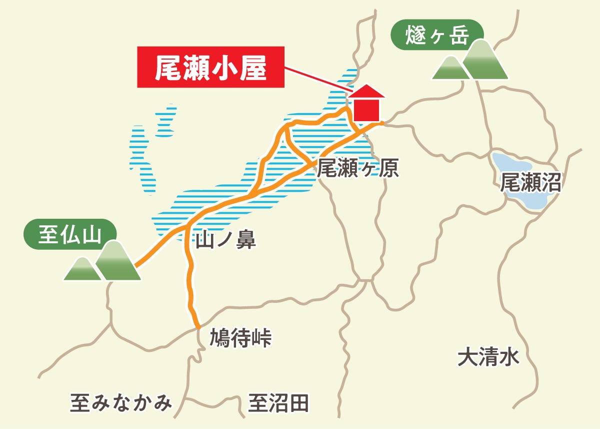 鳩待峠登山口前11:00集合-山ノ鼻-牛首分岐-竜宮十字路-尾瀬小屋(歩行約4時間)