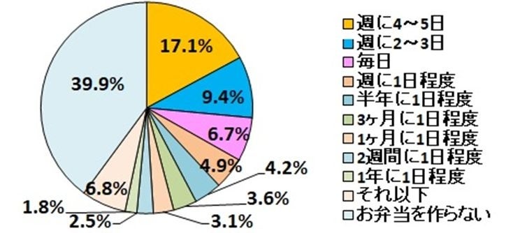 お弁当を作る頻度は、「週に4~5日」が17.1%と最多で、その後は「週に2~3日程度」9.4%、「毎日」6.7%、「週に1日程度」4.9%と続きました。 尚、「週に1日程度」以上の頻度が上位4つに並び、合わせると38.1%で、全体の4割近くの方が週1日以上の頻度でお弁当を作ることがわかりました。