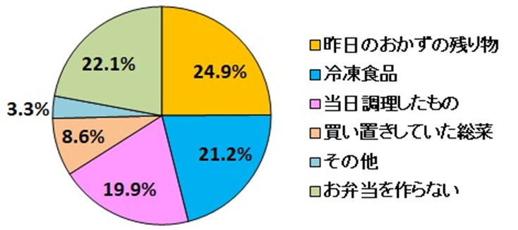お弁当の「おかず」について、どう準備するかを複数回答可で質問したところ、最も多かったのは「昨日のおかずの残り物」で、回答数の24.9%と約4分の1。次いで「冷凍食品」(21.2%)と「当日調理したもの」(19.9%)も2割前後を占めました。