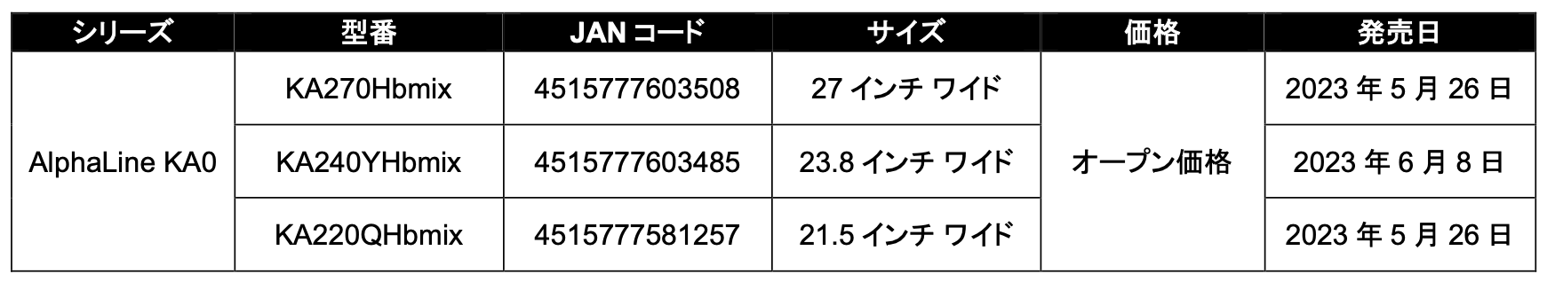 27インチ「KA270Hbmix」と21.5インチ「KA220QHbmix」は2023年5月26日(金)に発売し、23.8インチ「KA240YHbmix」は2023年6月8日(木)発売予定です。3機種すべてビックカメラグループ、ヨドバシカメラ、Joshin、ZOA、Acer公式オンラインストア、Acer Direct 楽天市場店、Acer Direct Yahoo! ショッピング店にて販売します※1。