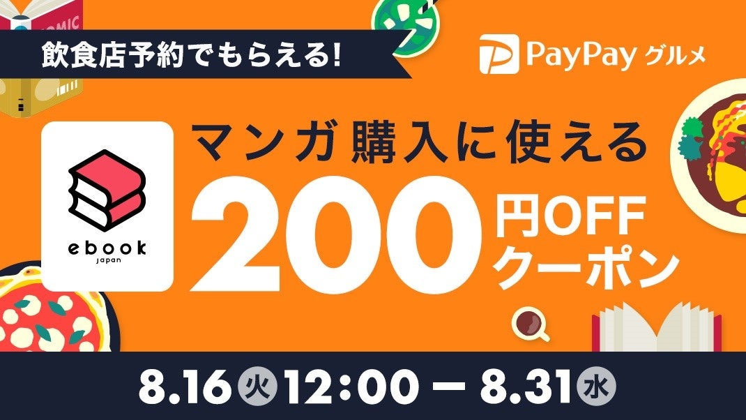 電子書籍販売サイト「ebookjapan」をヤフー株式会社と協力して運営する、株式会社イーブックイニシアティブジャパンは、ヤフー株式会社が運営する飲食店予約サービス「PayPayグルメ」で飲食店を予約すると予約者全員がもらえる、「200円OFF電子書籍クーポンキャンペーン」を2022年8月16日(火)12:00から8月31日(水)23:59の期間にてキャンペーンを実施します。