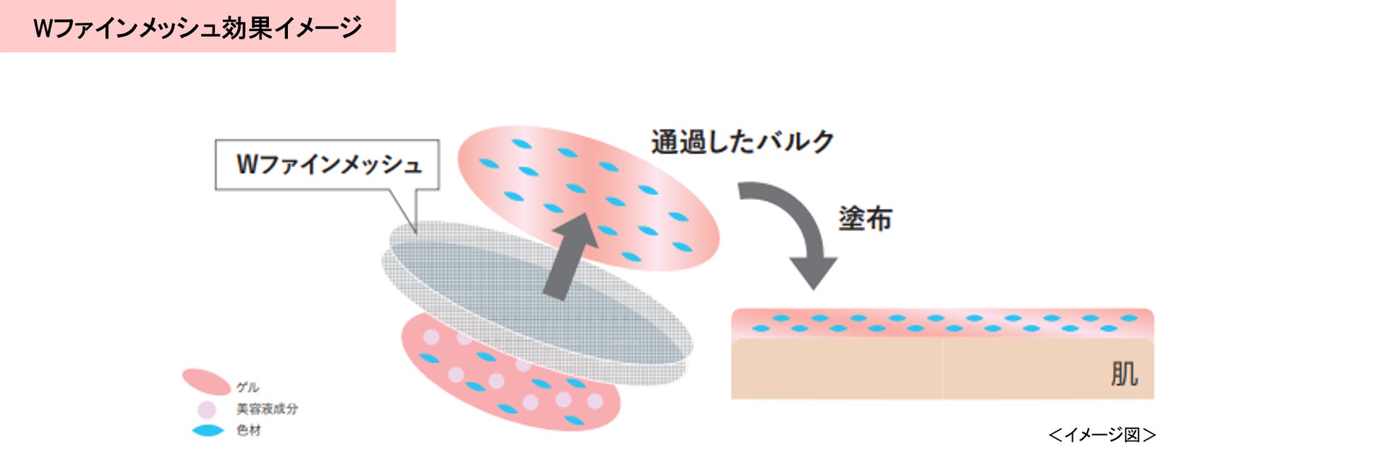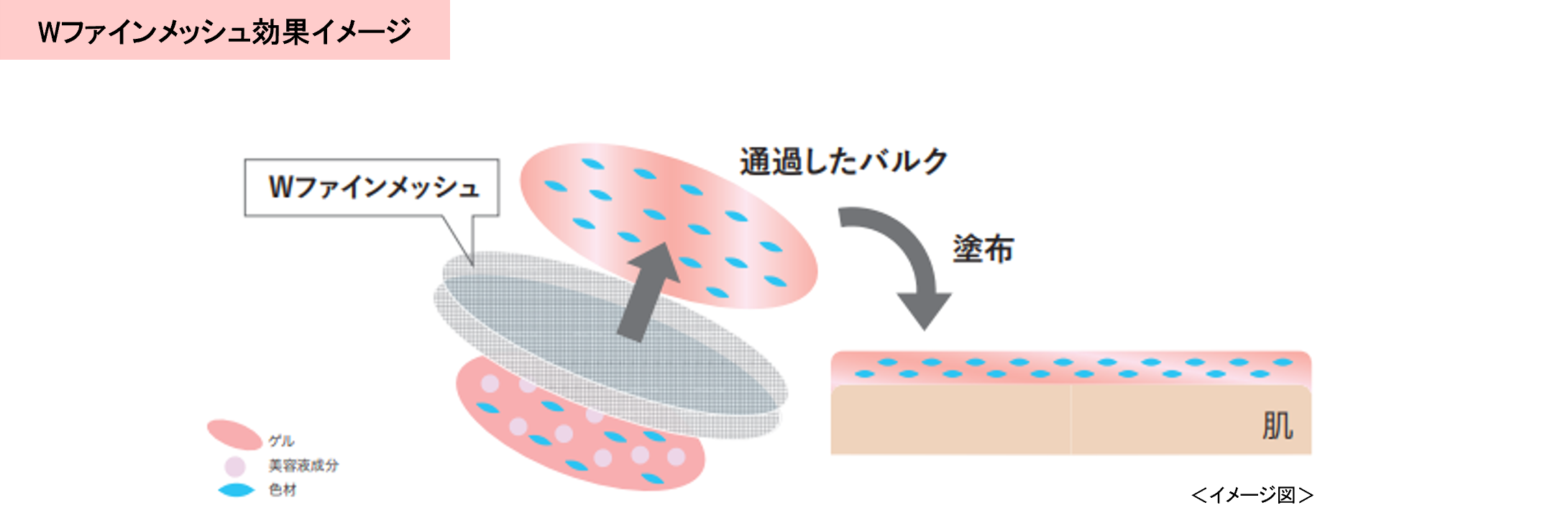 また、二重のメッシュがバルクを均一にし、厚塗り感なくキメの整ったなめらか上質肌をかなえます。