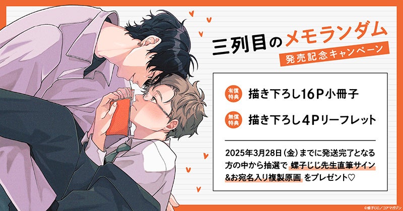 ホーリンラブブックスでは、螺子じじ先生最新コミックス『三列目のメモランダム』発売を記念して豪華キャンペーンを実施いたします!