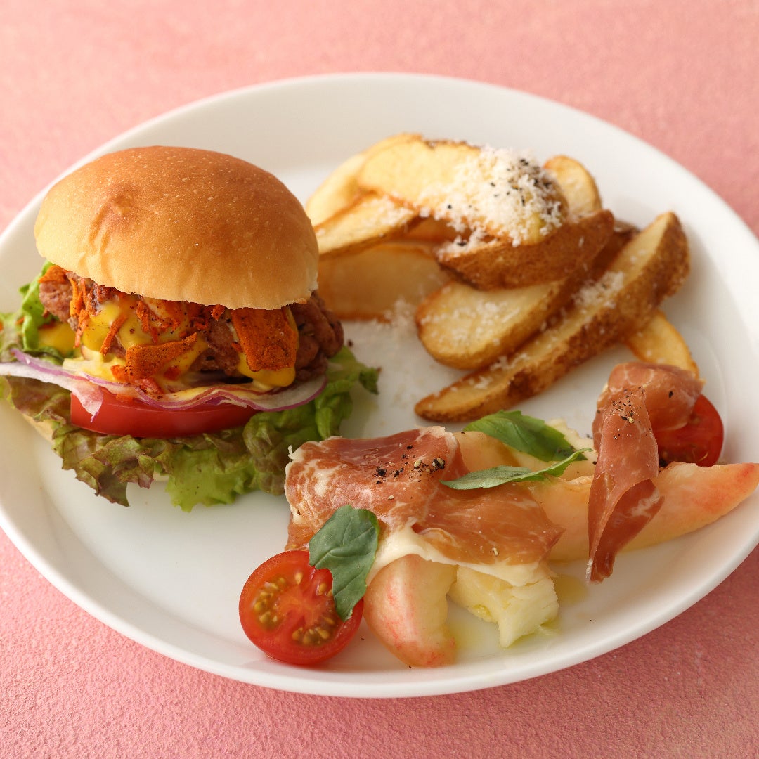 さらに「白桃のカプレーゼ」や「オリジナルスパイシーチキンバーガー」など、ワインとよく合うセイボリーもお楽しみいただけます。桃のアフタヌーンティーを味わいながら、緑いっぱいのオープンテラスで贅沢なひとときをお過ごしください。