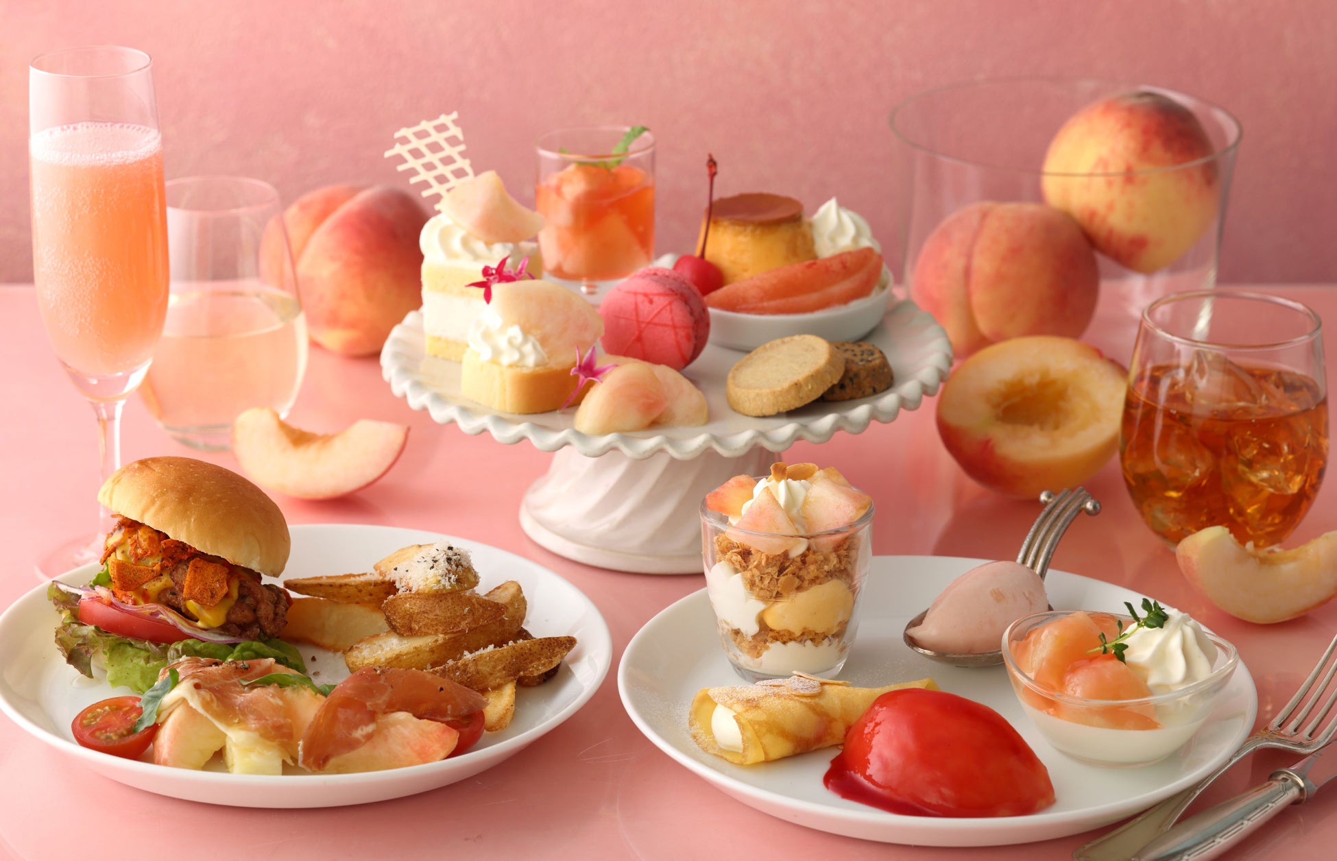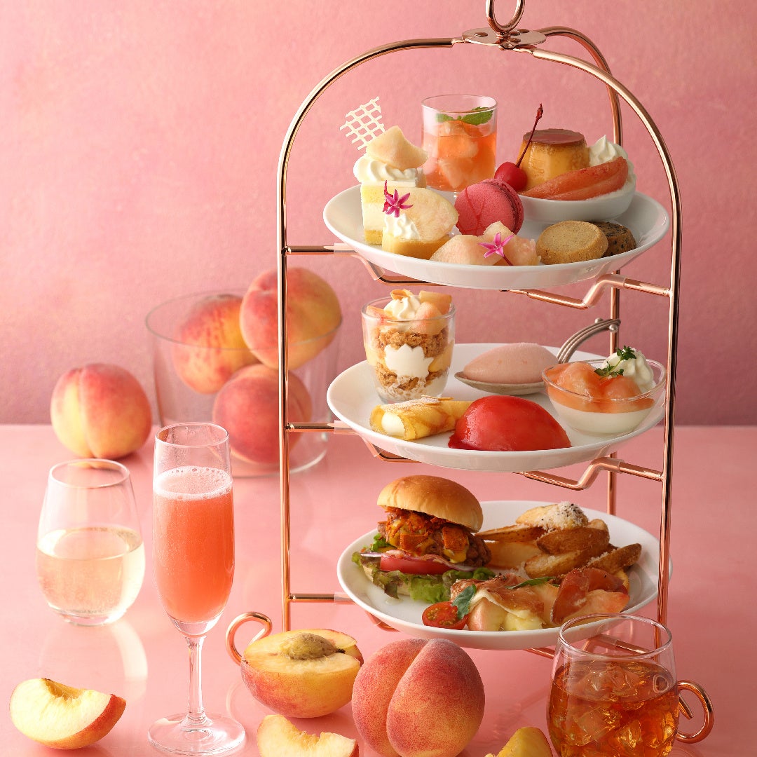 アフタヌーンティースタンドに華やかに盛り付けられたスイーツは、ピーチジュレに白ワインを加えて大人の味わいに仕上げた新作「白桃のマチェドニア」や、こだわり卵で作るプリンと桃のコンポートをあわせた「白桃のプリン・ア・ラ・モード」、焦がしバターを加えて風味豊かに焼き上げた自家製クレープに軽くマリネした桃を添えた「ピーチメルバクレープ」など、桃をふんだんに盛り込んで提案。