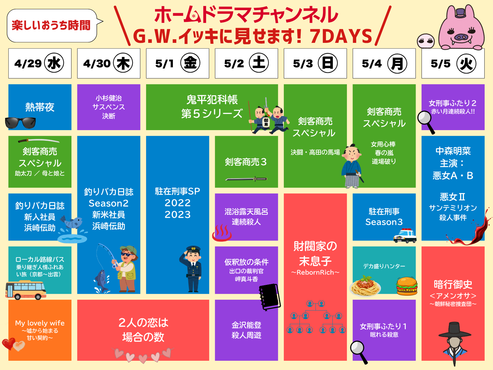 ホームドラマチャンネルでは今年もやります!「GWイッキに見せます!7DAYS」4/29(水)~5/5(火)に人気のドラマを一挙放送!(スカパー!では一部番組無料放送)