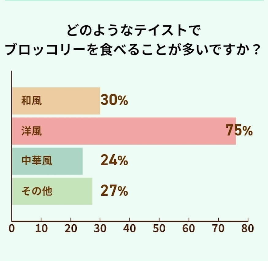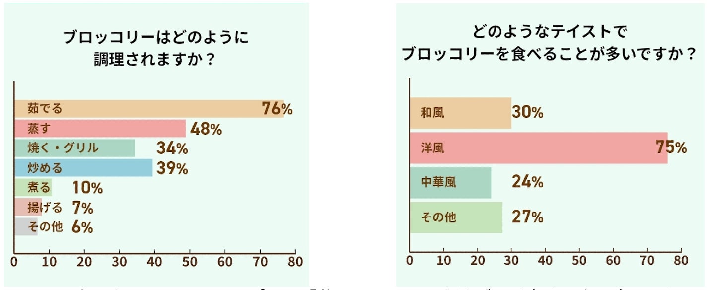 「蒸す」という方法でした。風味については、洋風にして食べることが多く、洋風の食事が増えてきたことにつれて、合わせるサラダや付け合わせなどでブロッコリーを食べるシーンが増えたように推測できます。多かった料理メニューは、サラダ、シチュー、グラタンなどで、一風変わった料理メニューとしては、「おかか和え」「韓国風ナムル」「天ぷら」といったお声もありました。