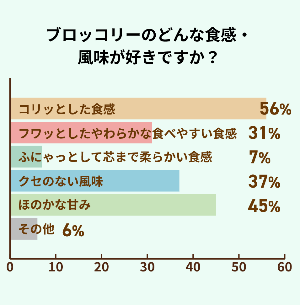 ブロッコリーの好きな食感や風味については、コリッとした食感、ほのかな甘味、クセのない風味が