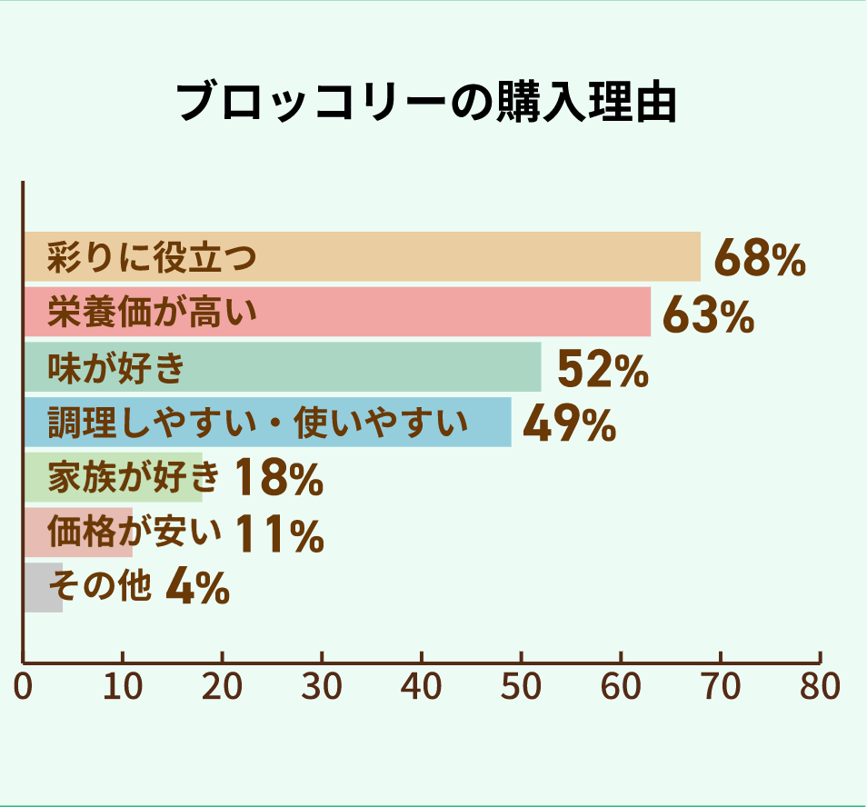 ●ブロッコリーの購入理由は「食卓やお弁当の彩りに役立つ 68%」「栄養価が高い 63%」「味が好き 52%」「調理しやすい 49%」