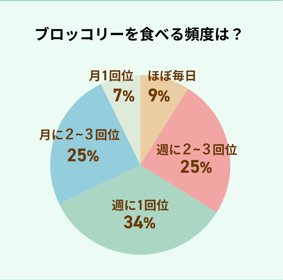 ブロッコリーが好きかどうか、また食べる頻度について聞いたところ、ブロッコリーが苦手な人はわずか「1%」。22%が普通、77%が好きという回答でした。食べる頻度については、7割が週1回以上ブロッコリーを食べているということで、ブロッコリーが苦手な人が少ないことや、好んで食べる人が多いことから、家庭・給食・外食等どんな場面でもメニューに並び易い理由がありました。