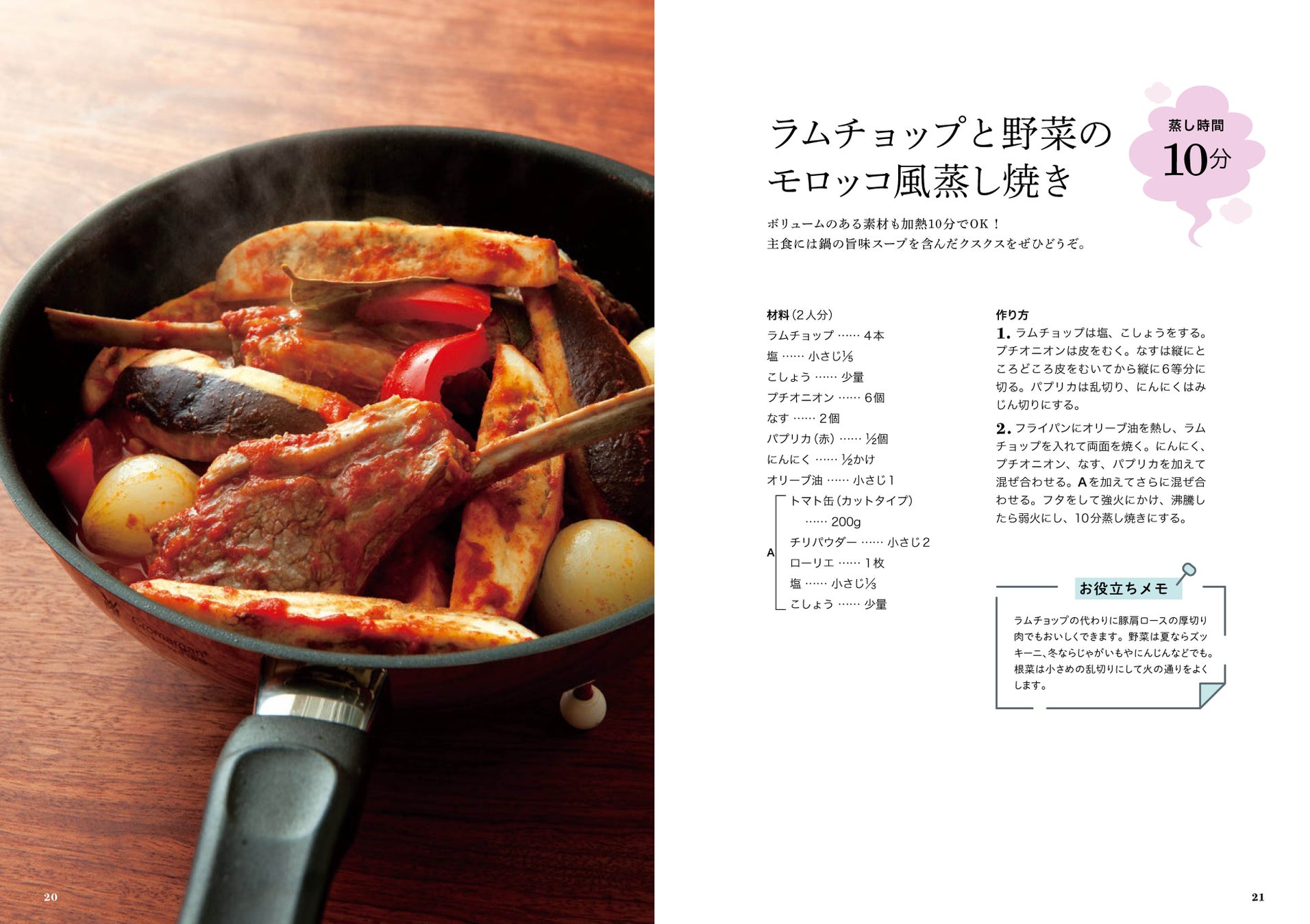 「ほったらかしでOK!フライパンや鍋に材料を入れたら、フタをして蒸すだけ。ほったらかしで待っているだけで、鍋やフライパンの中の素材が旨味たっぷりにおいしく仕上がります。」