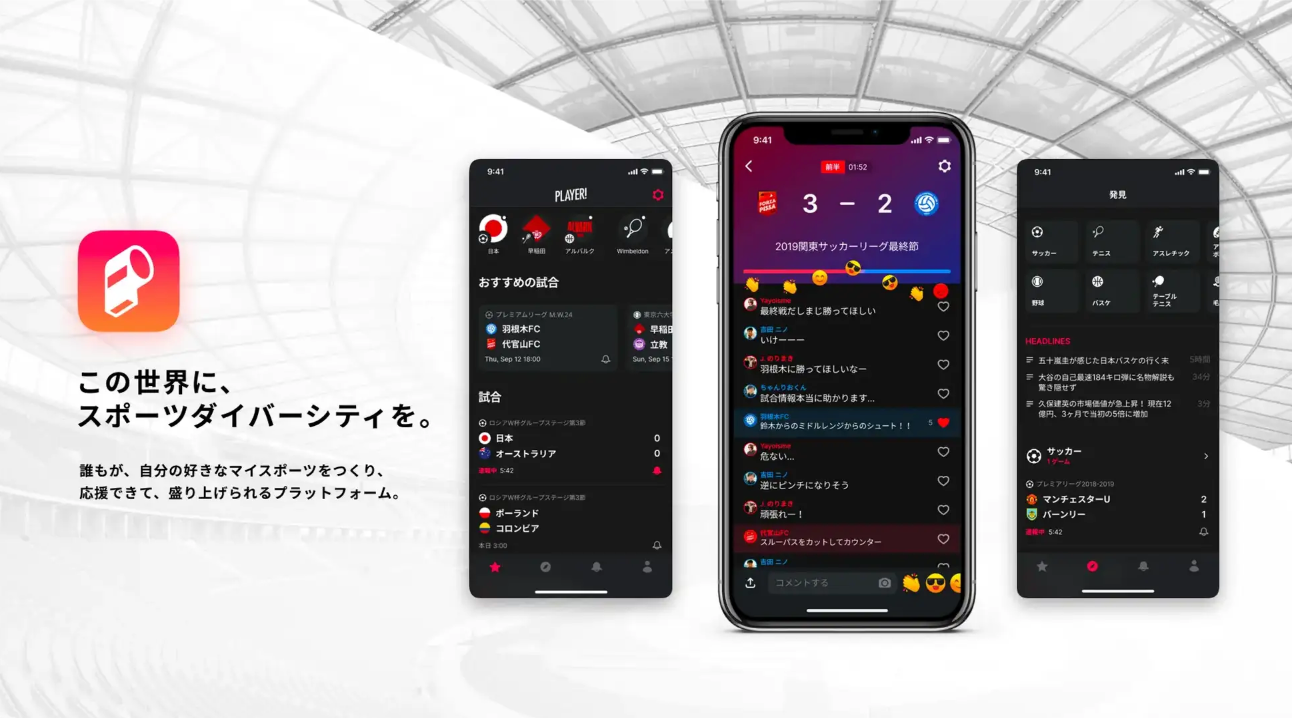 Player!は、誰もが、自分の好きなマイスポーツをつくり、応援できて、盛り上げられるプラットフォームです。