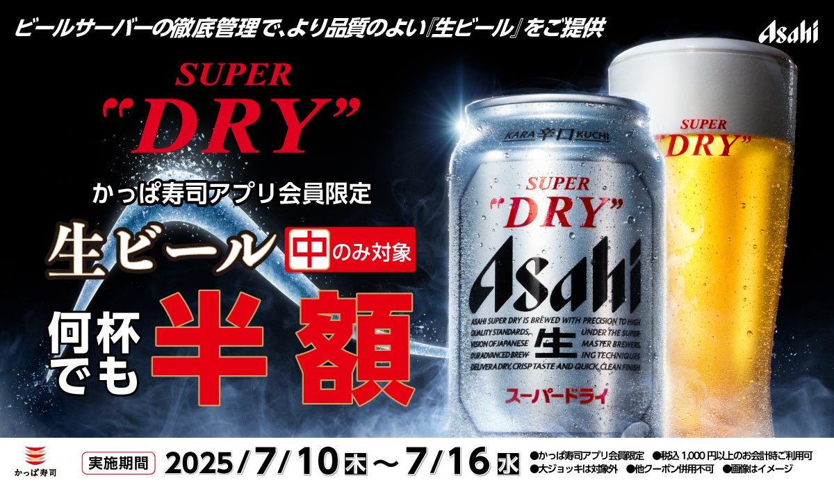 暑さや物価高を吹き飛ばせ!7月10日からかっぱ寿司が贈る“クールなご褒美”! 生ビール(中)半額クーポンを7日間限定で配信!【かっぱ寿司】公式アプリ会員へ生ビール半額クーポンを配信!