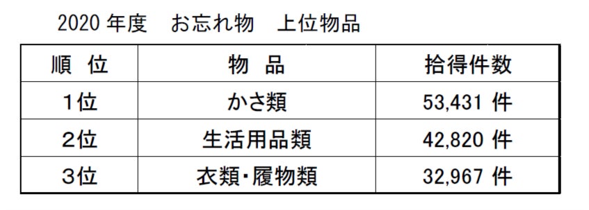 2020年度における当社のお忘れ物受領件数は、約35万件となっており、