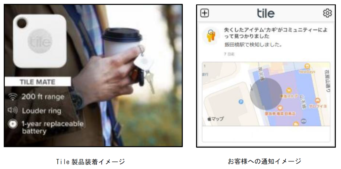 お忘れ物通知サービス「Tile」は、日本輸入総代理店であるSB C&S株式会社が提供するTile製品とTileアクセスポイントを活用し、持ち主のスマートフォン内のアプリから探し物を検索できるサービスです。TileアクセスポイントではTile製品のBluetooth電波を受信し、位置情報を持ち主のスマートフォン内のアプリに通知します。Tileアクセスポイントを東京メトロ線内のお忘れ物が集約される飯田橋駅構内のお忘れ物総合取扱所に設置することで、Tile製品の付いたお忘れ物の情報がお客様に通知され、お忘れ物を早期に発見できるようになります。