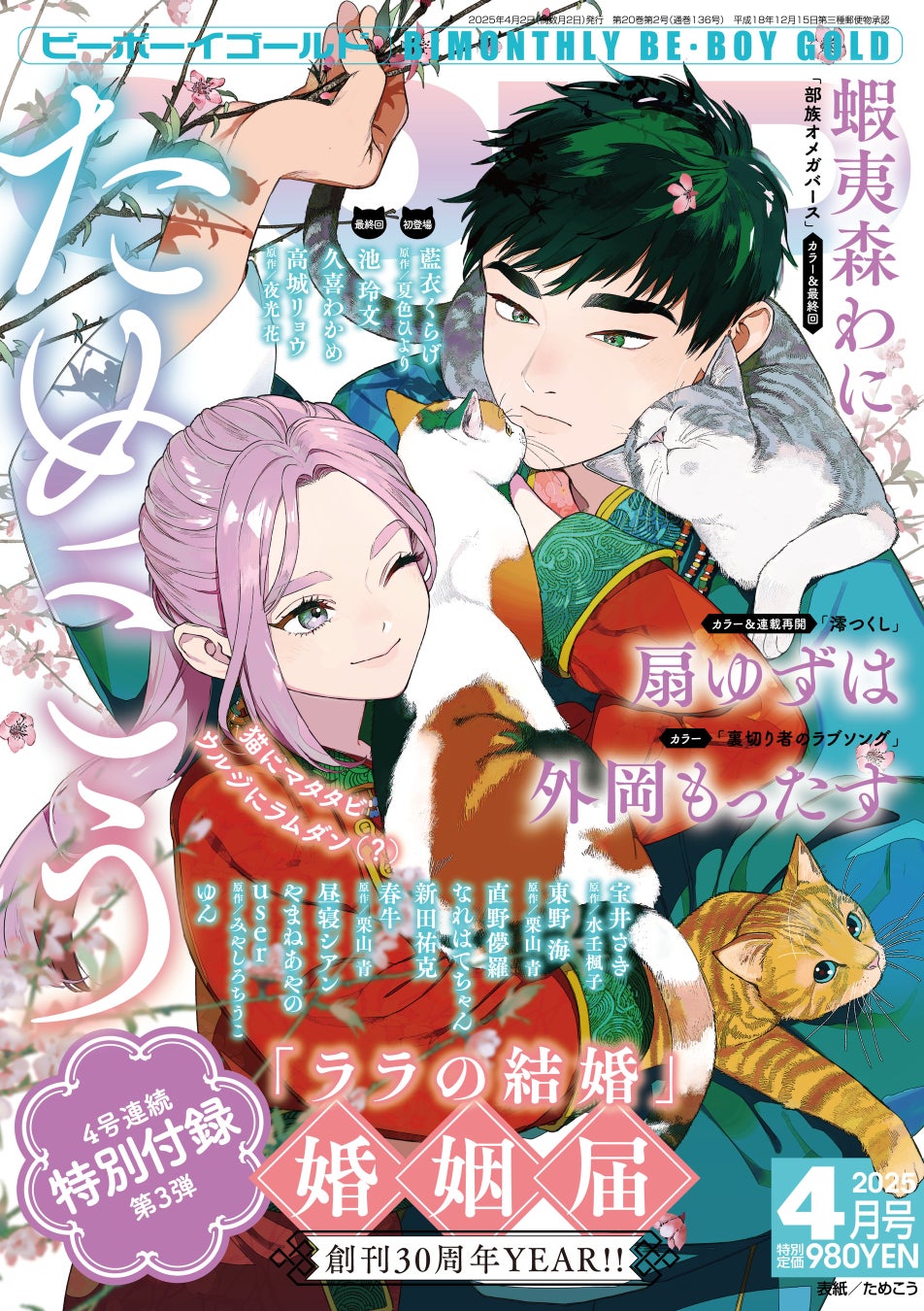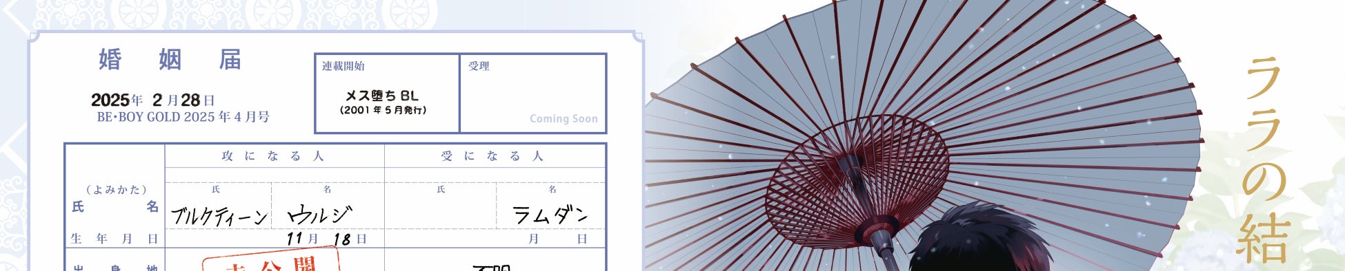 4号連続特別付録第3弾! ためこう先生「ララの結婚」婚姻届けが付いてくる! BE・BOY GOLD 2025年4月号本日発売!