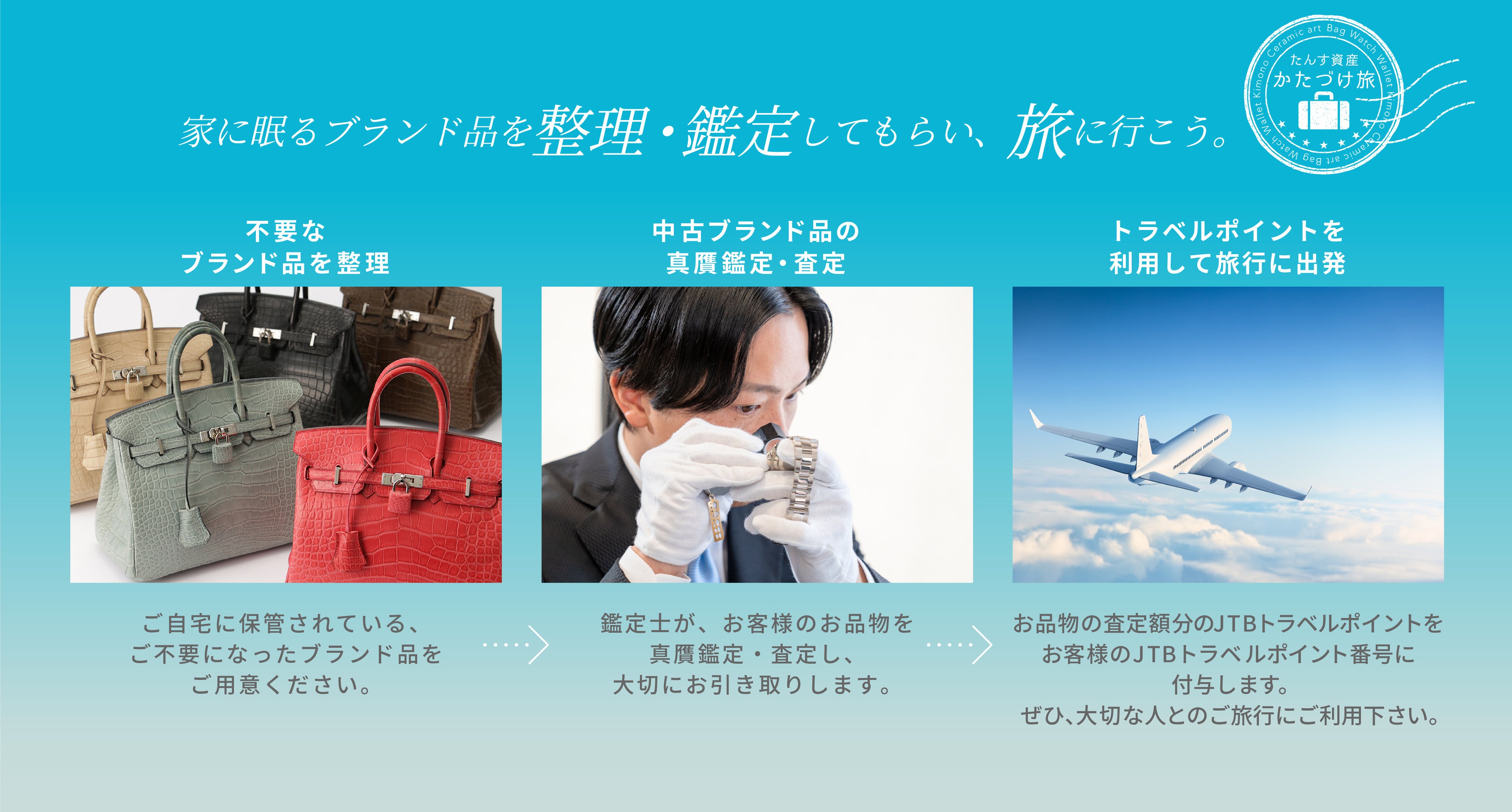 株式会社JTB(本社:東京都品川区 代表取締役 社長執行役員:山北 栄二郎、以下「JTB」)は、株式会社大黒屋(本社:東京都港区 代表取締役社長:小川浩平、以下「大黒屋」)と業務提携を行い、お客様のご家庭に眠っている中古ブランド品を、旅の思い出に変える新サービス「たんす資産かたづけ旅」の概念実証(POC)を、日本で初めて開始します。