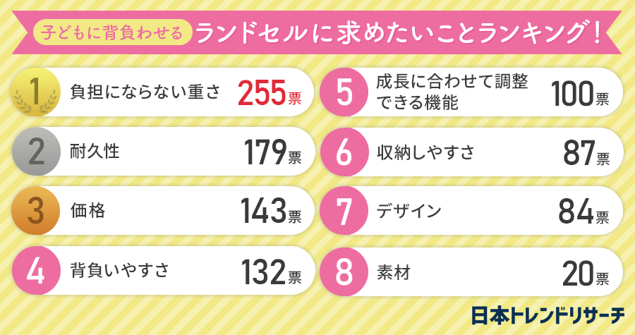 ランドセルを選ぶ際に重視したいポイント第1位は、255票を集めた「負担にならない重さ」でした。