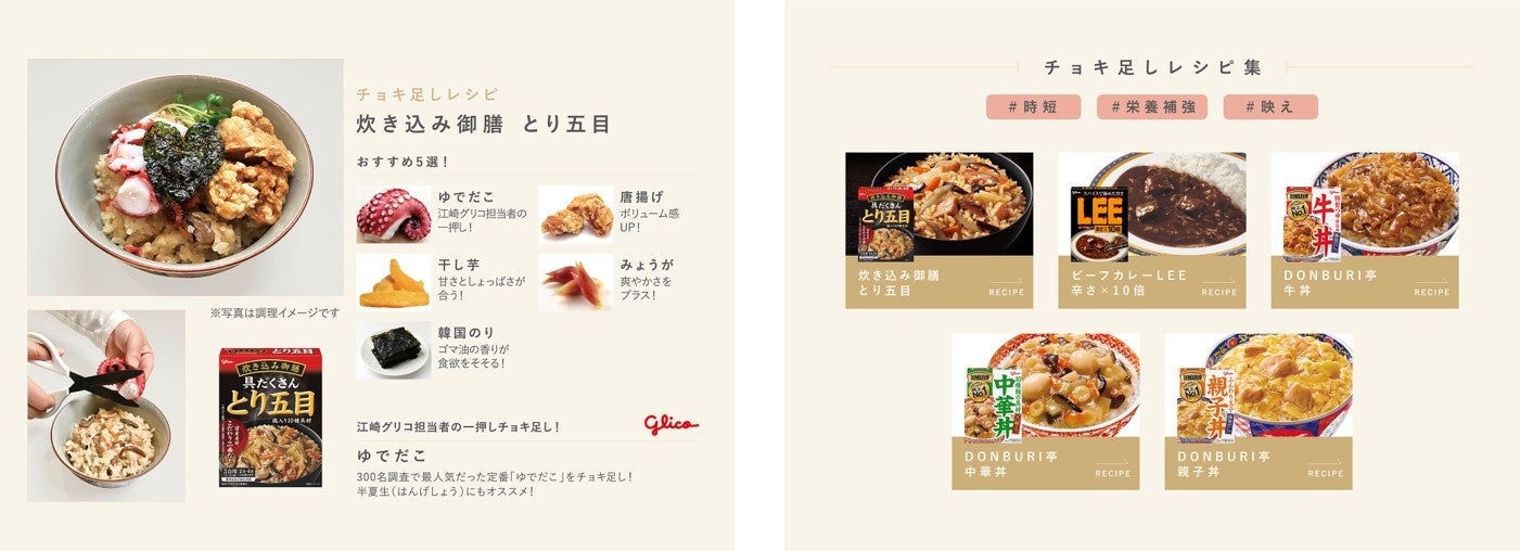 家族の形態が多様化する社会を背景に、時短など効率の良さからレトルト食品を便利に使う食卓のシーンが増えていますが、一方で手抜き感や栄養価への不安を持つ人は少なくありません。今回、人気レトルト食品を多く販売する江崎グリコとのコラボレーションが実現し、人気の5商品(炊き込み御膳「とり五目」、ビーフカレーLEE「辛さ×10倍」、DONBURI亭「牛丼」、「親子丼」、「中華丼」)に「チョキ足し」することで、簡易でありながらより健康的なレシピを両社の公式ホームページで公開します。江崎グリコによる監修で、栄養や見栄えにも配慮したレシピとなっています。