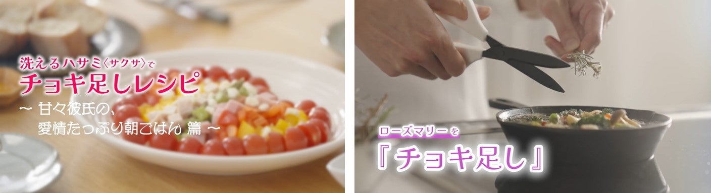 「おかえり、ごはんできてるよ篇」「愛情たっぷり朝ごはん篇」「ふたりきりのおうちキャンプ篇」の3つのシーン別に、それぞれ「洗えるハサミ」を使ってのチョキ足しレシピを紹介しつつ、イケボに癒されながら楽しめる動画です。