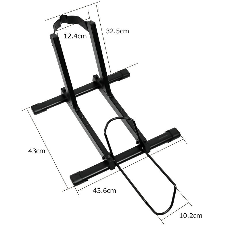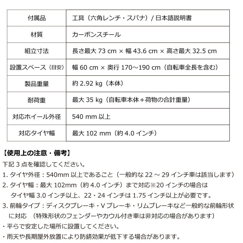 ・前輪専用。後輪に差し込まないこと(チェーン干渉の恐れあり)。 ・平らで安定した場所に設置してください。 ・前輪は必ず奥まで差し込むこと(浅い差し込みは転倒の原因となる)。 ・荷物の重心が偏ると転倒の恐れがあります。 ・雨天や長期屋外放置により防錆効果が低下する場合があります。 ・組立後はスイングアーム固定部のネジを定期的に点検してください。 ※・20インチ車はタイヤ幅3.0インチ以上に対応。 (20インチ車のうち、一般的な折りたたみ自転車・小径電動アシスト車の多くはタイヤ幅2.0~2.5インチのため、標準仕様では非対応です。 カスタマイズで3インチ以上の太めタイヤを装着している場合は対応可能です。) |