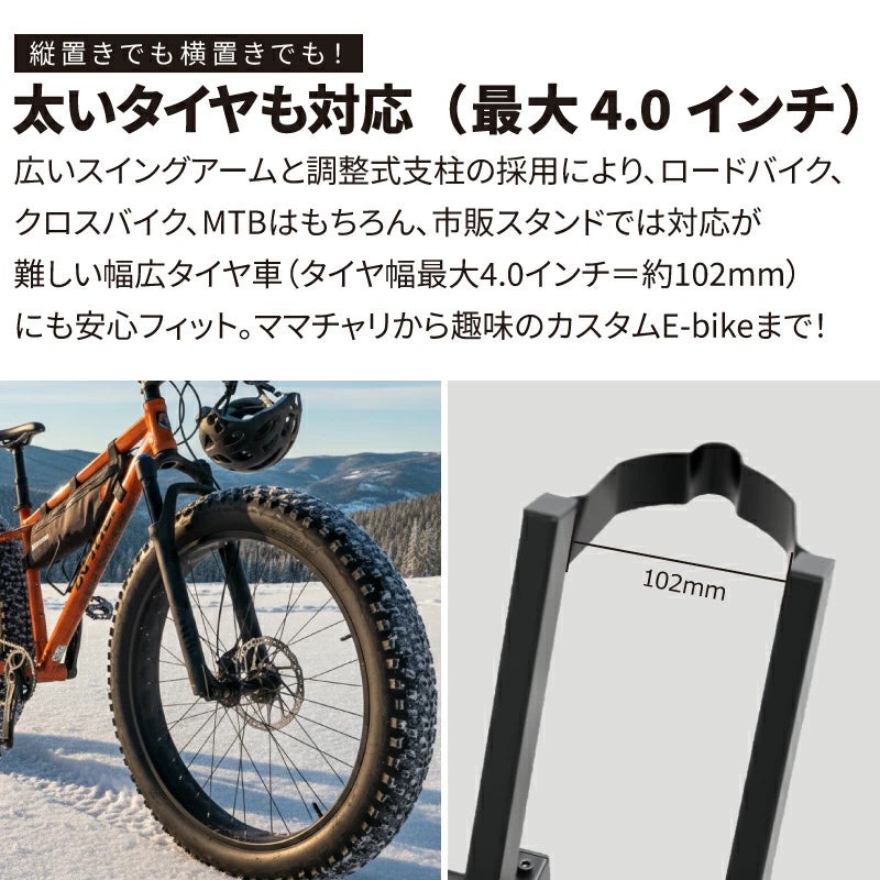 ●ロード、MTBからファットバイク(最大4.0インチ)まで幅広い車種にフィット。