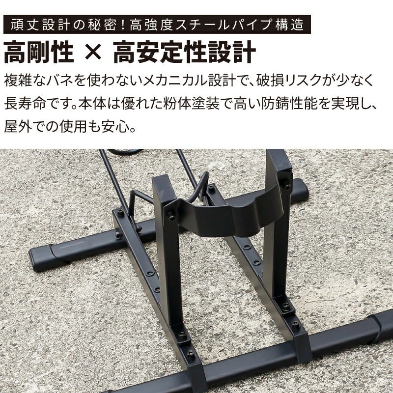 E-bikeや電動アシスト自転車などの重量車体にも対応する高剛性・ワンステップ駐輪スタンドが