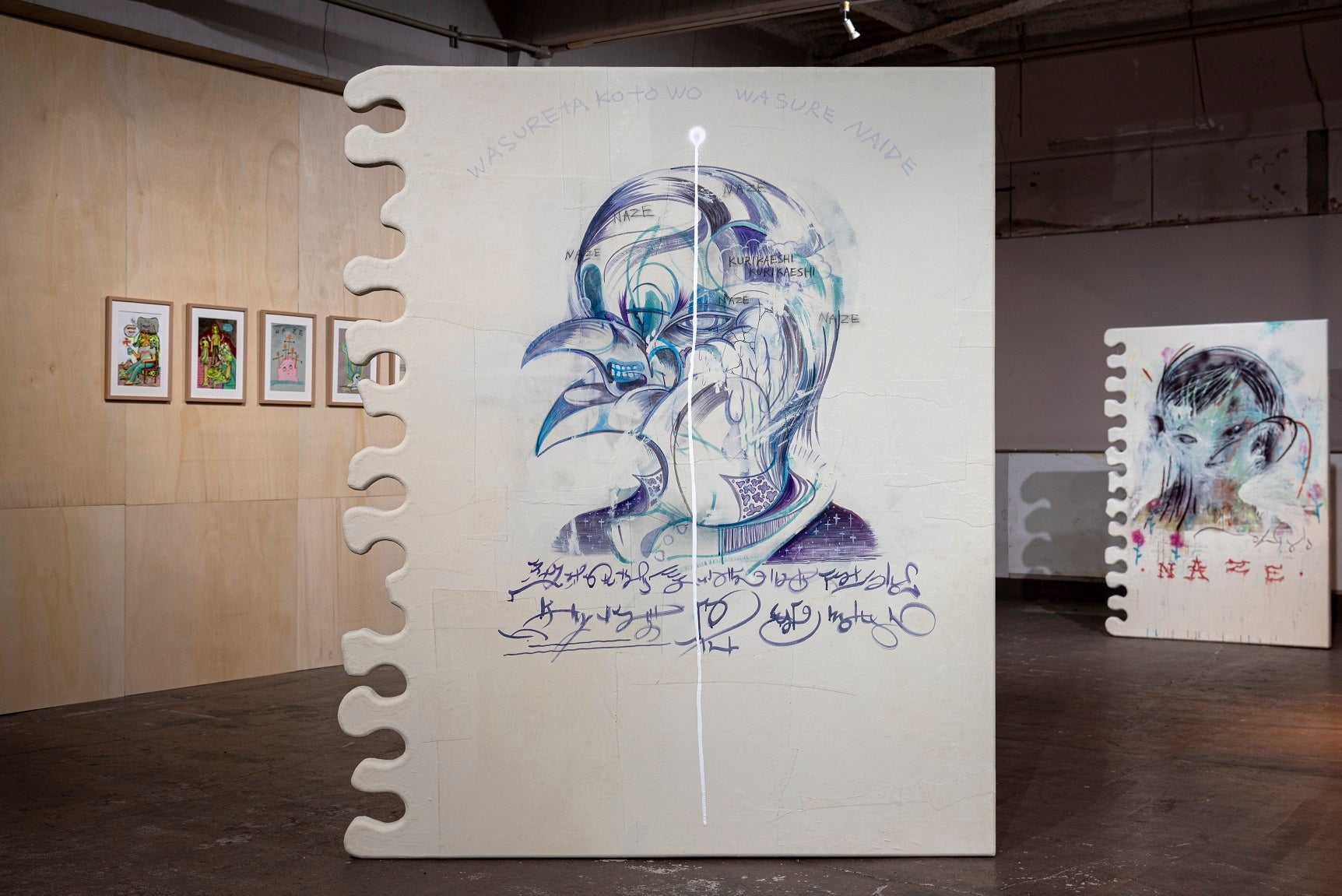 NAZEはこれまで、グラフィティやストリートカルチャーをベースに、壁画のような大型作品、触覚的な筆致で描かれるドローイング、スプレーやコラージュを用いたペインティング、廃棄物を使ったオブジェクトなど、多彩な作品を発表してきました。